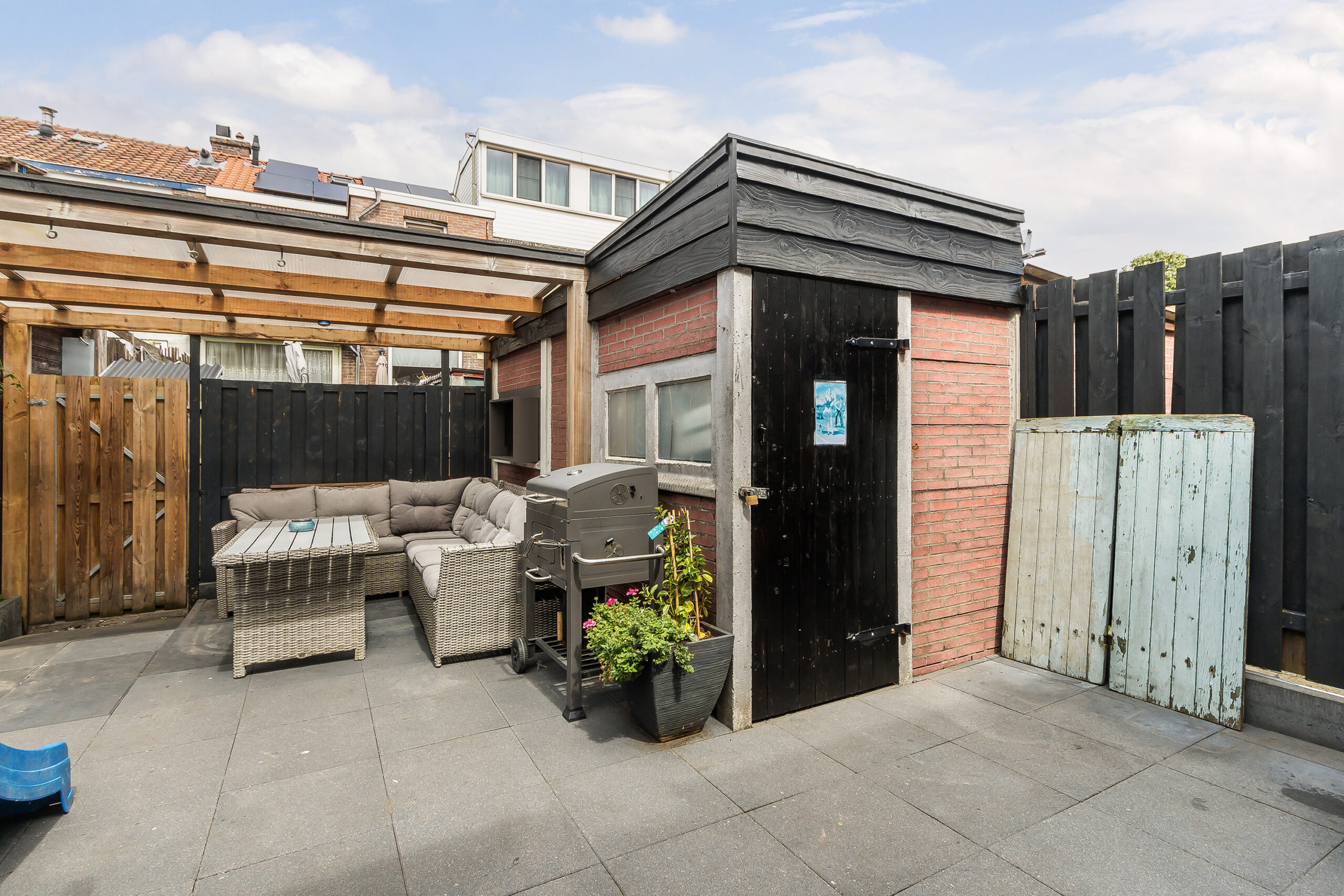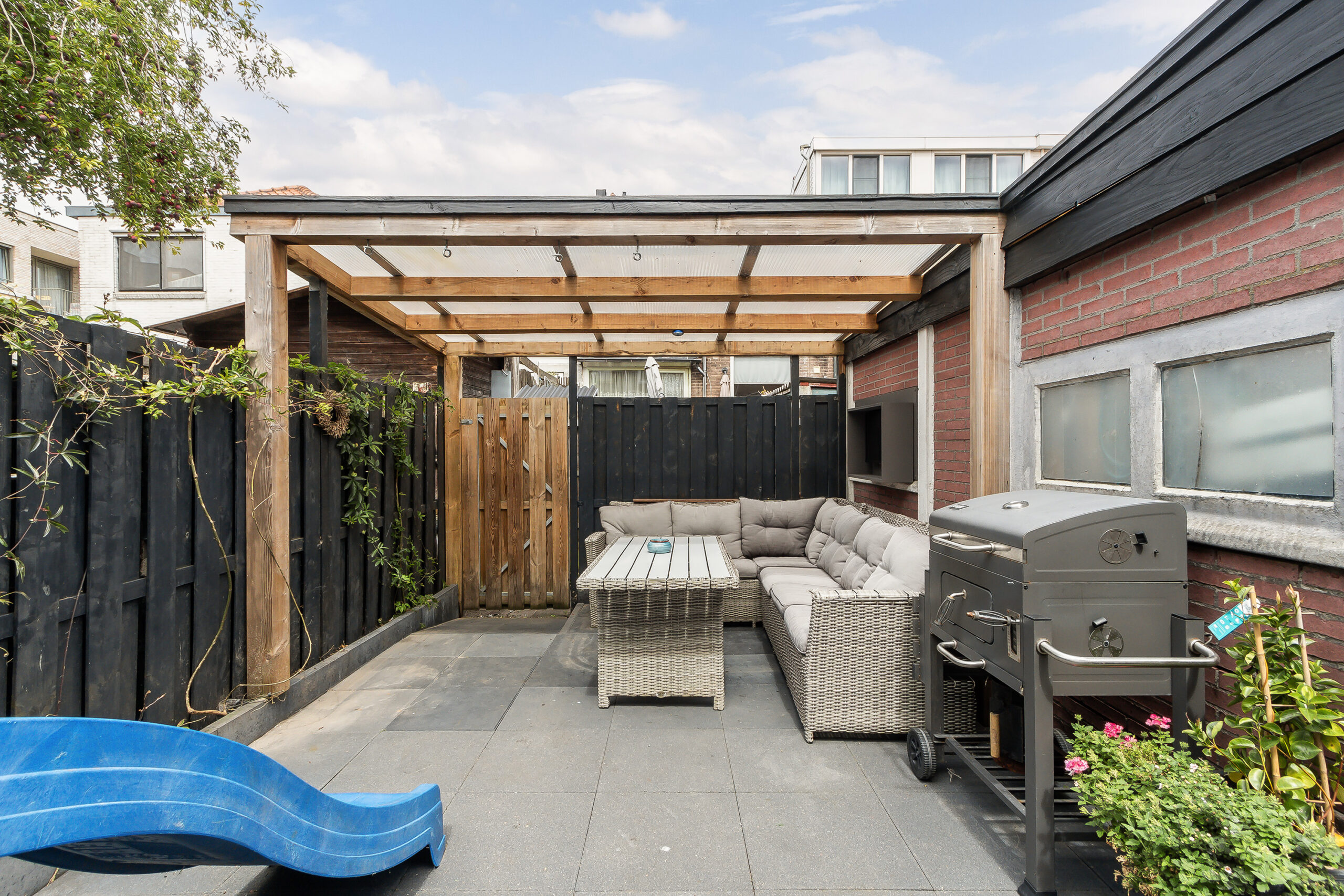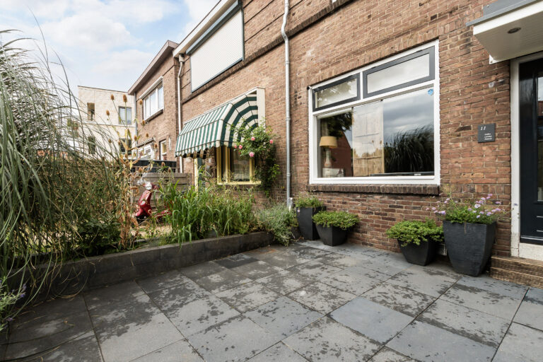 De woning beschikt over een verzorgde voortuin met sierbestrating en vaste beplanting. De achtertuin is keurig aangelegd met grote lichtgrijze tuintegels, een sfeervolle overkapping aan de berging vast, een achterom en een stenen berging voorzien van elektra.