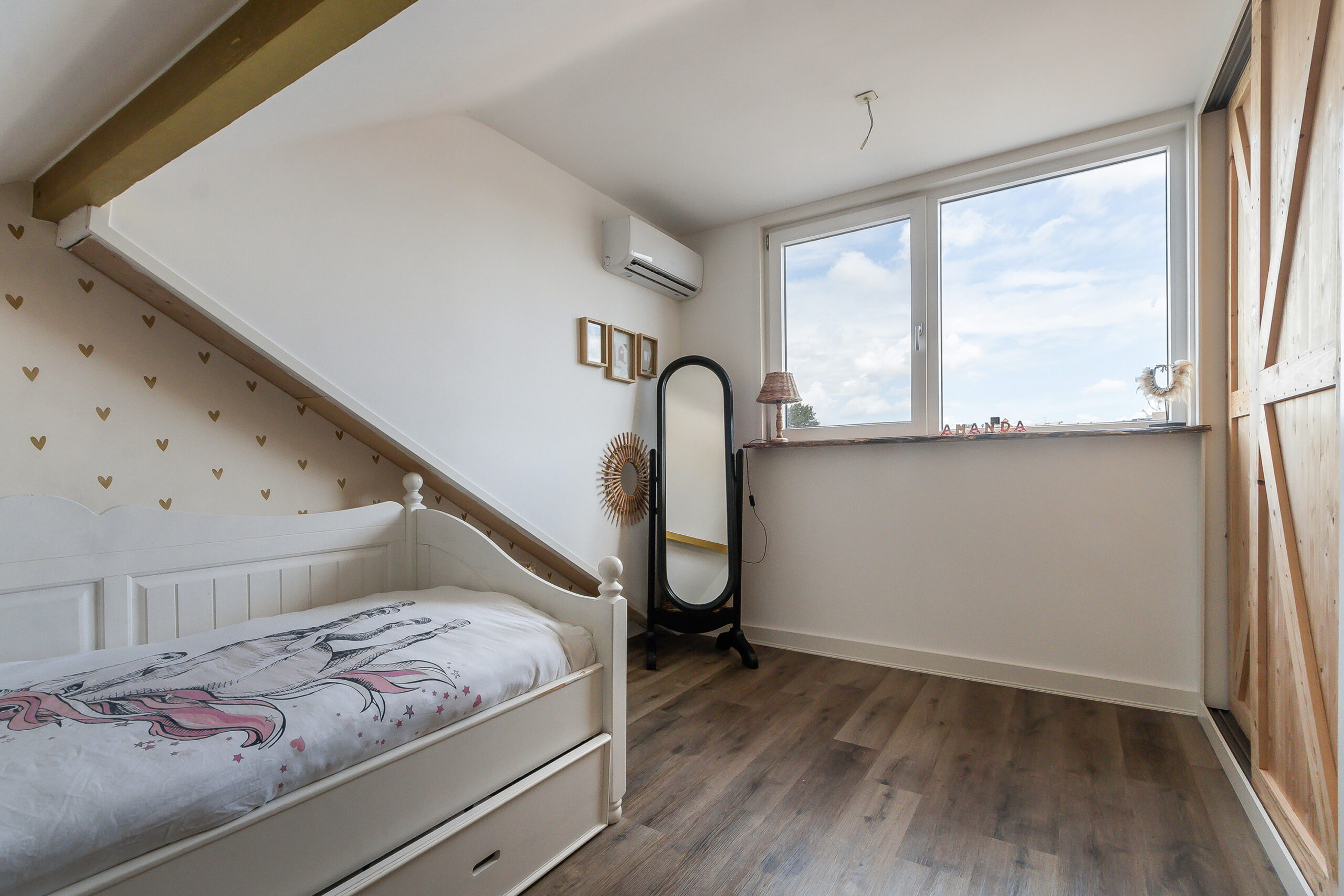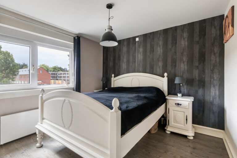Overloop met schuifkast, waarin het tweede toilet en de aansluitingen voor de wasmachine zijn weggewerkt. Op de overloop bevindt zich ook de opstelplaats van de CV-ketel (2012). De ruime vierde slaapkamer is voorzien van airconditioning en een dakkapel (2021) met geïntegreerde rolluiken. De kamer is afgewerkt met een PVC-vloer, biedt veel daglicht en beschikt over volop bergruimte.