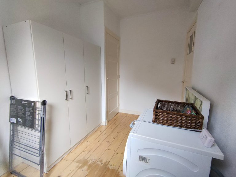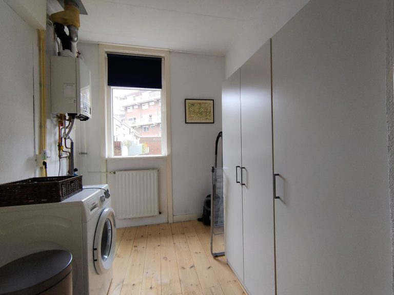 Deze slaapkamer met vaste kast is gelegen aan de achterzijde van het appartement. In deze kamer bevinden zich ook de wasmachine en de opstelplaats van de CV-combiketel (Nefit uit 2016).