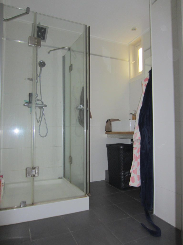 Vanuit de gang is de badkamer te bereiken welke geheel is betegeld en is voorzien van een douchecabine met thermostaatkraan en een wastafel.