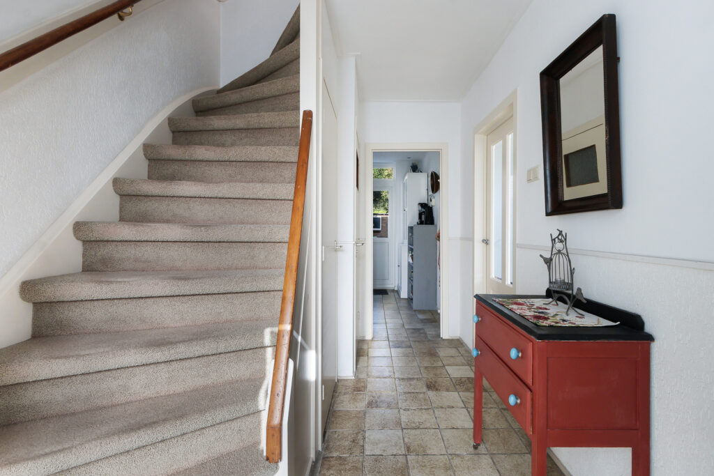 Entree met toegang tot het toilet, de woonkamer, trapkast en trapopgang naar de eerste verdieping.