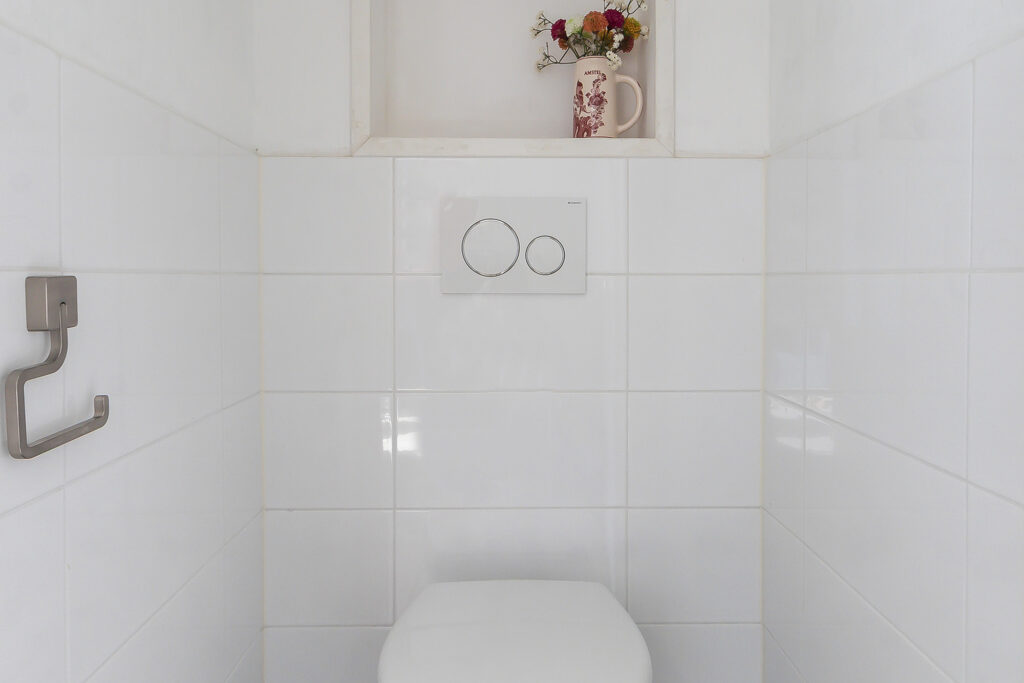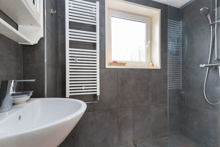 De moderne badkamer (2020) ligt aan de voorzijde en is voorzien van een inloopdouche, wastafel en handdoekradiator.