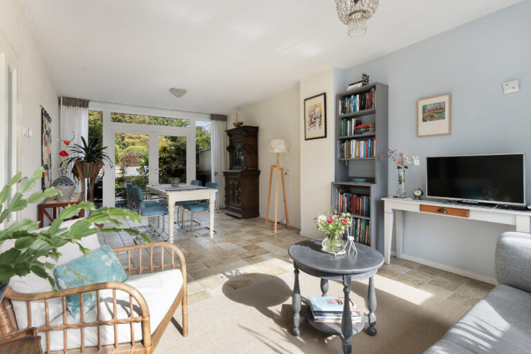 De ruime en lichte woonkamer heeft een plavuizen vloer en glad gestucte wanden. Aan de achterzijde zorgen openslaande deuren voor toegang tot de tuin. Het woongedeelte loopt naadloos over in het eetgedeelte.