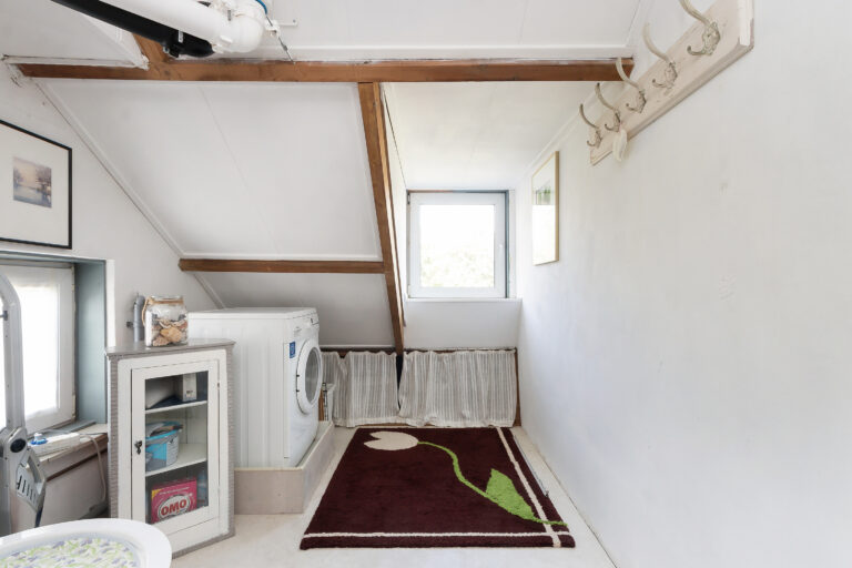 Overloop met toegang tot de vierde slaapkamer en enkele knieschotten met bergruimte. Hier bevinden zich ook de opstelplaats van de cv-ketel en de aansluiting voor een wasmachine.