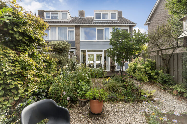 De woning beschikt over een verzorgde voortuin en een diepe achtertuin van circa 11 meter op het noordwesten. De achtertuin is licht en groen: er is in de zomer vrijwel de hele dag wel ergens zon, maar ook altijd een plekje in de schaduw te vinden. Dit maakt de tuin met warme temperaturen extra prettig. De voortuin heeft vrijwel de hele dag zon en is bovendien groot genoeg om in te zitten.