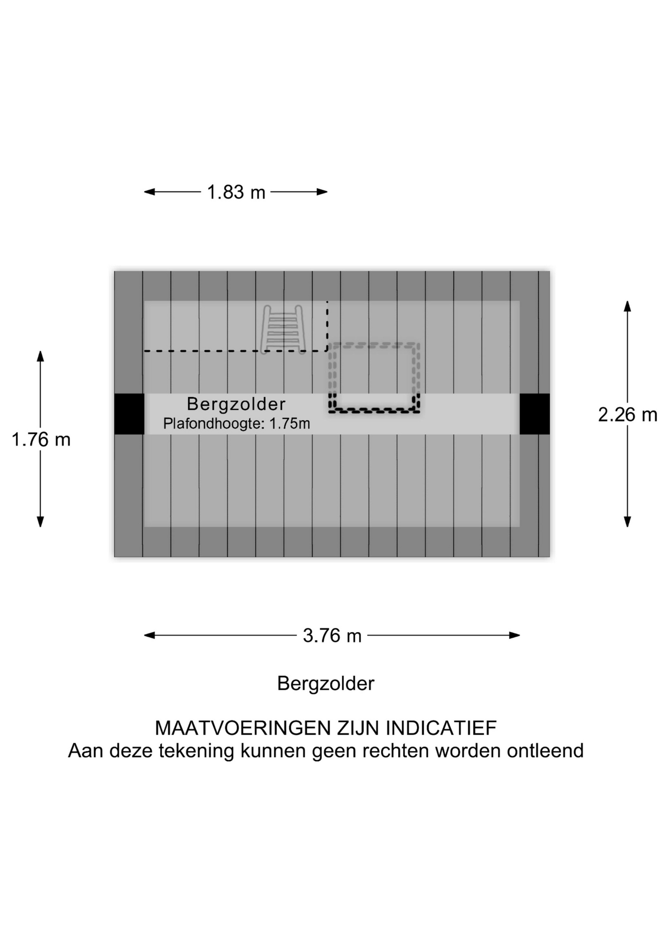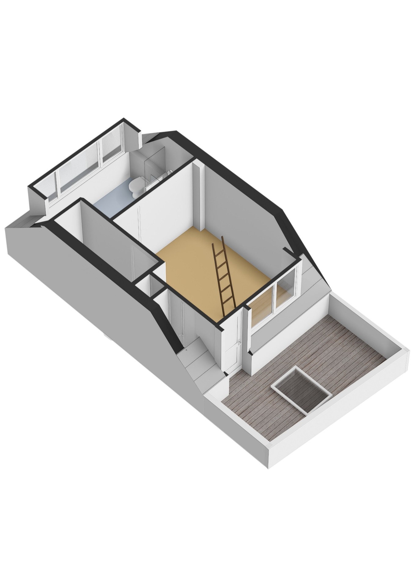 Grote open ruimte, momenteel in gebruik als werk-/studeerkamer, met deur naar het royale dakterras en vaste trap naar de slaapvide in de nok. Je kunt hier makkelijk een slaapkamer van maken en de vide als bergruimte gebruiken.