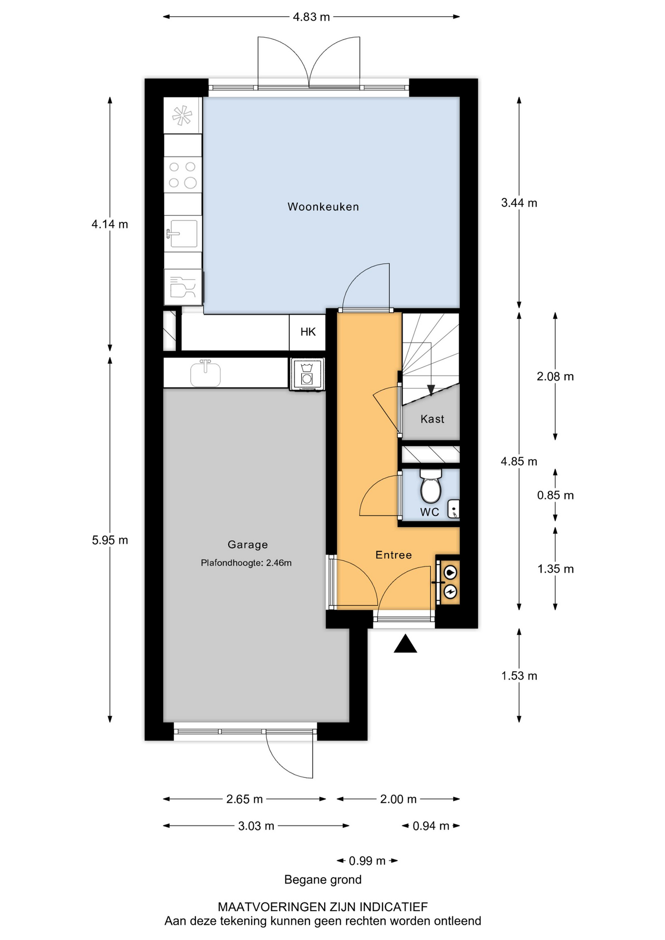 Entree/hal met meterkast, toilet, trapopgang, trapkast en toegang tot de garage.