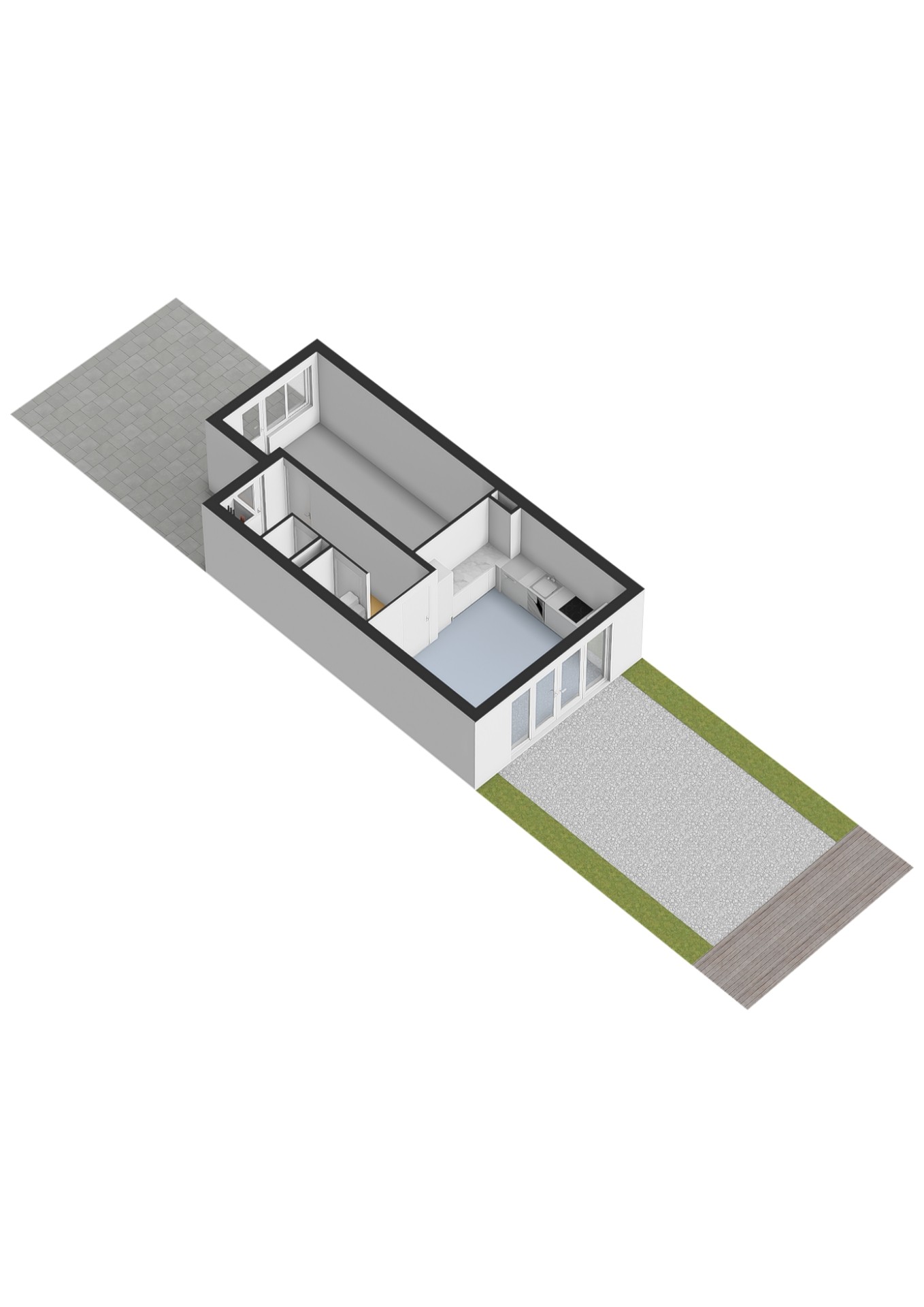 Voortuin is betegeld en fungeert als eigen parkeerplaats. De achtertuin is grotendeels opgevuld met grit en enkele borders (waterdoorlatend). Van de houten steiger zijn in 2023 de rottende planken vervangen; de staat van de steiger is redelijk.