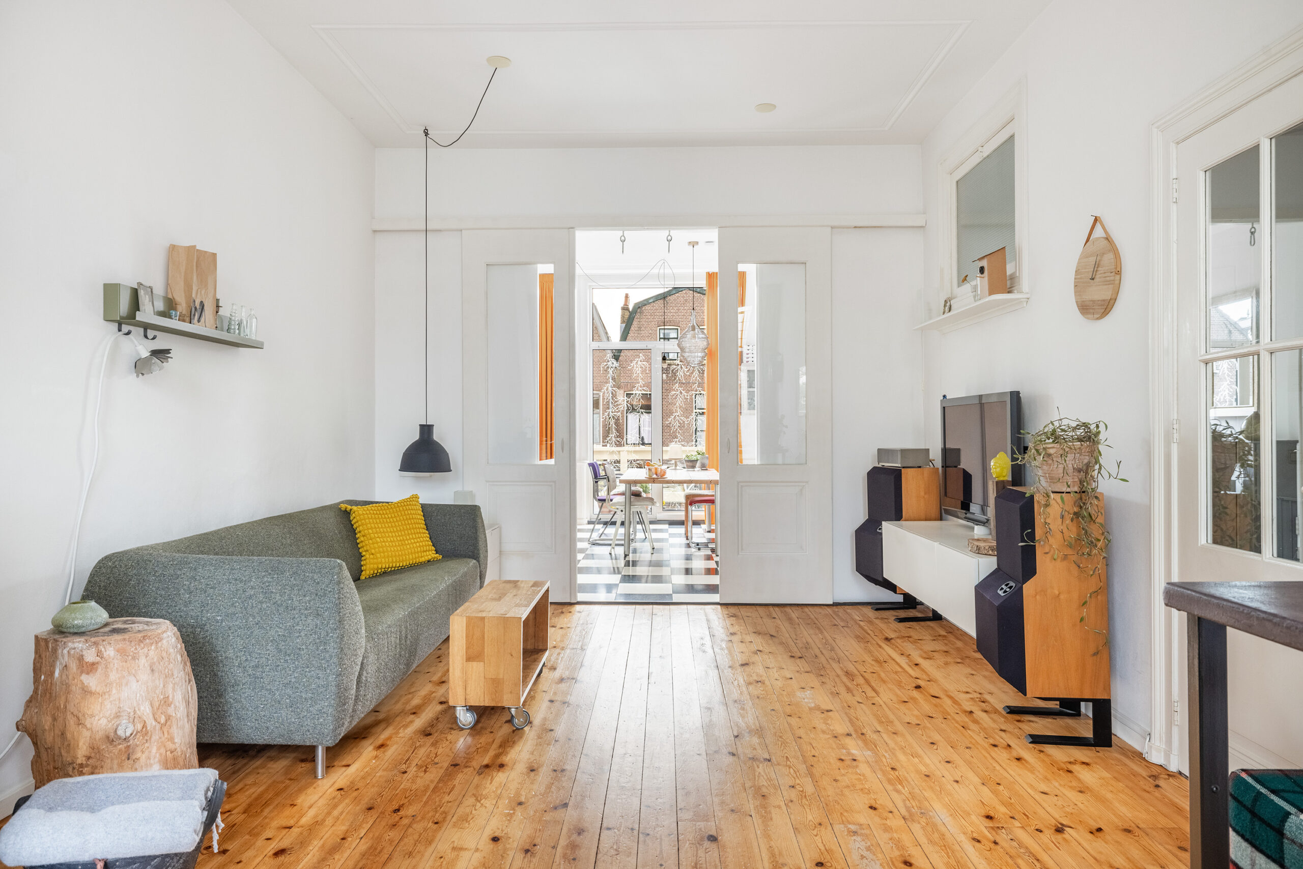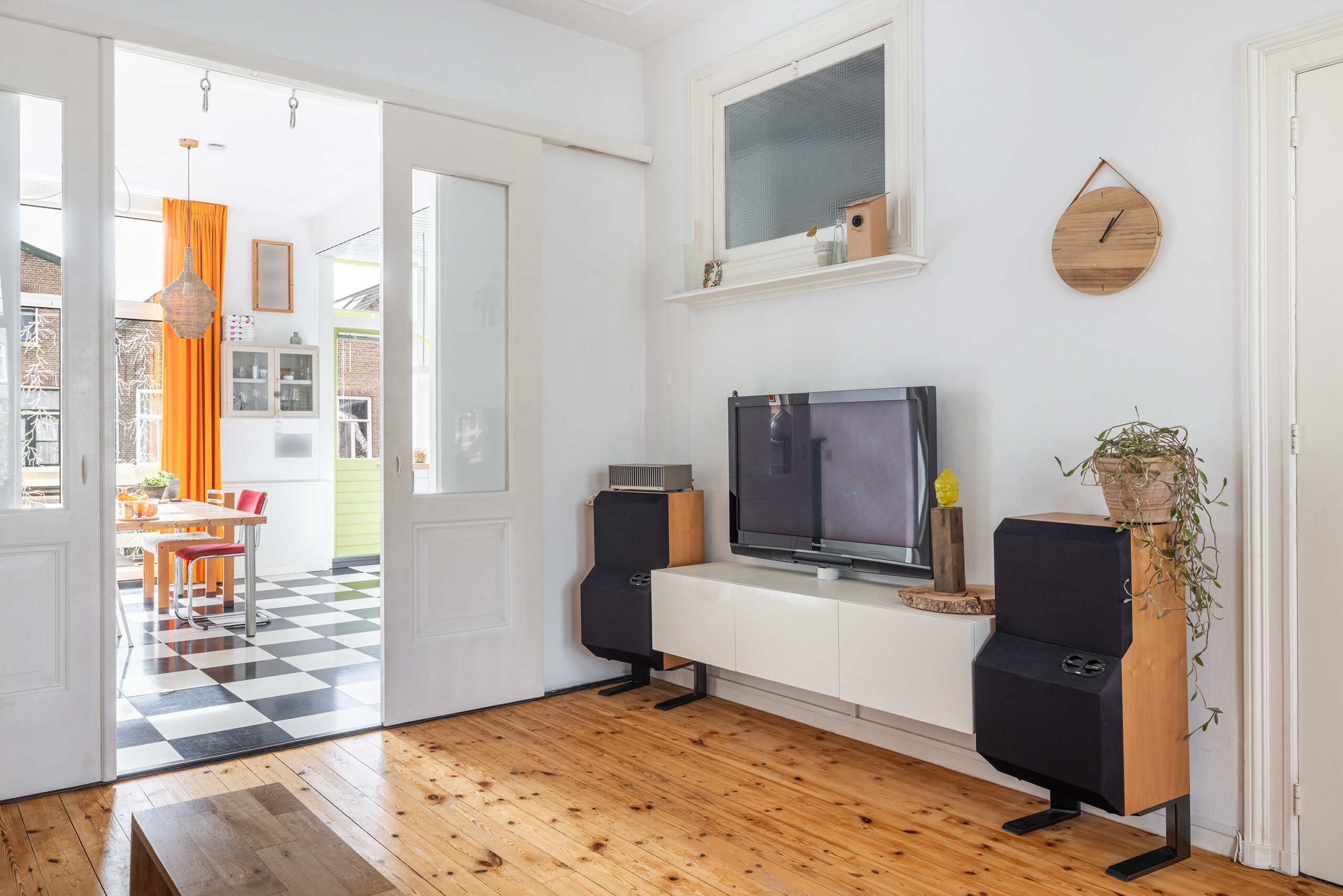 Lichte woonkamer voorzien van houten vloerdelen, glas-in-loodramen en een gaskachel. Via paneeldeuren verbonden met de woonkeuken.