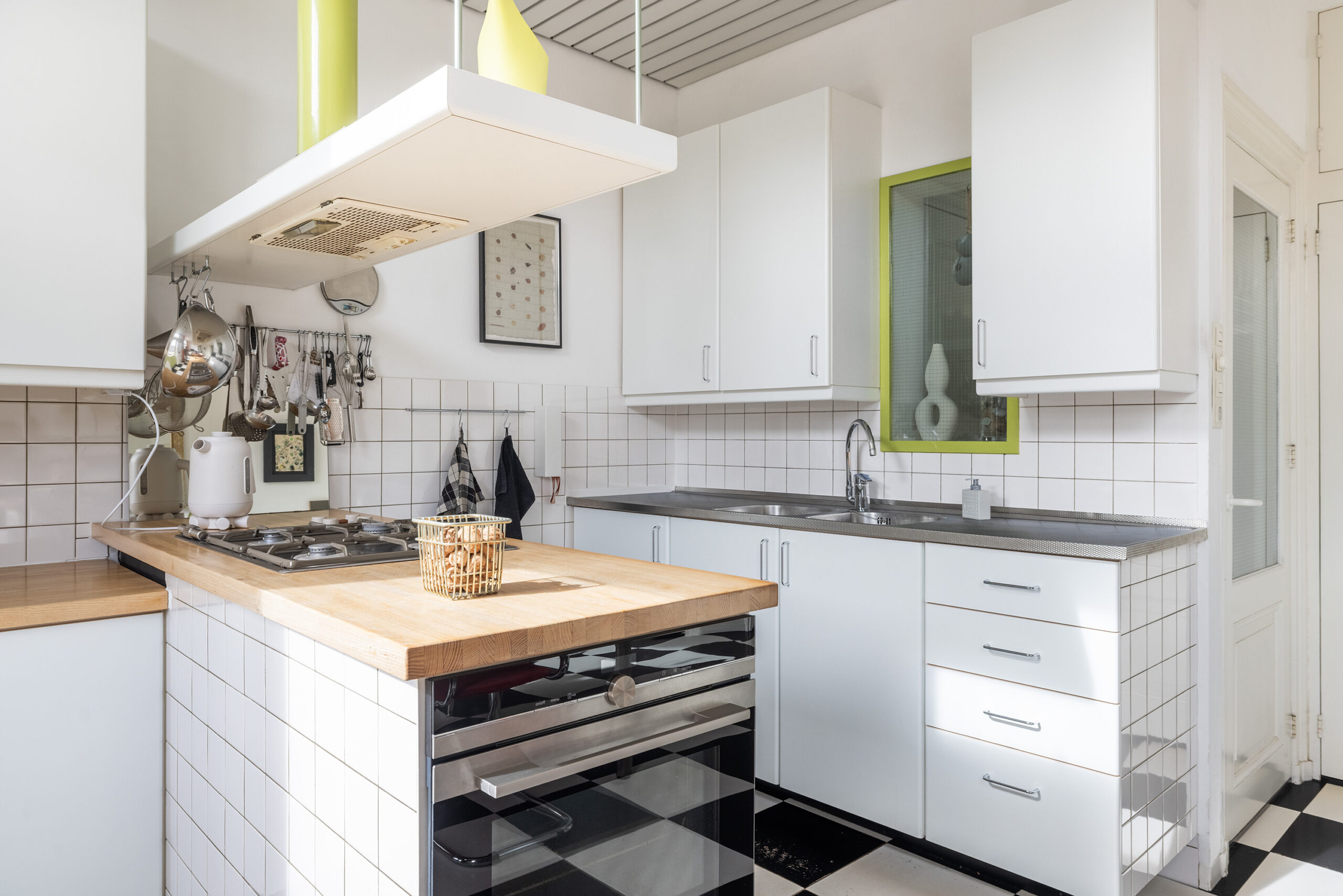 Ruime woonkeuken met zwart-witte tegelvloer en een lichte opstelling met boven- en onderkasten. Voorzien van diverse inbouwapparatuur, waaronder een gaskookplaat, afzuigkap, dubbele spoelbak, oven (2022) en koelkast (2015). Tevens aanwezig een gaskachel en een schuifpui naar het balkon op het zuiden.