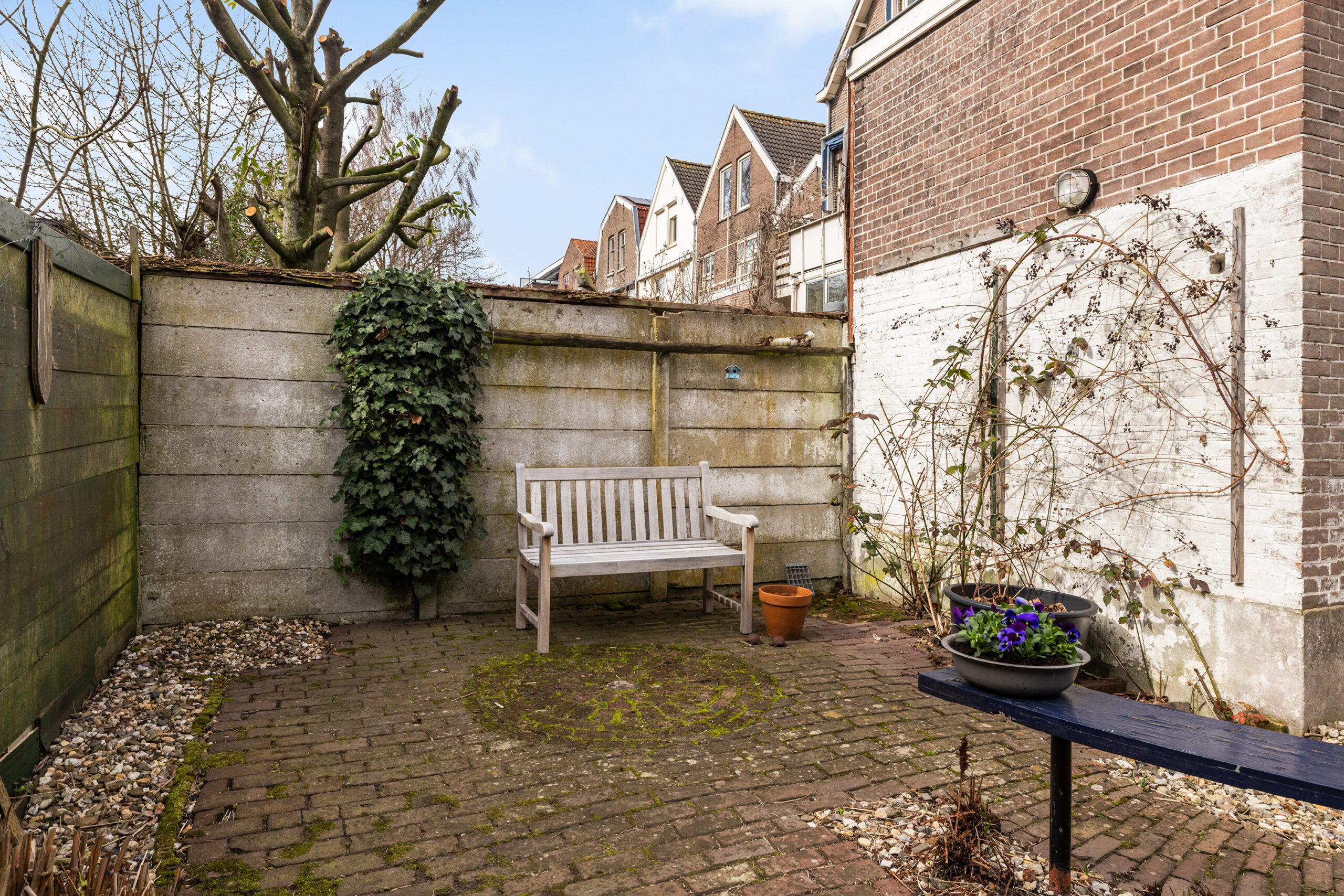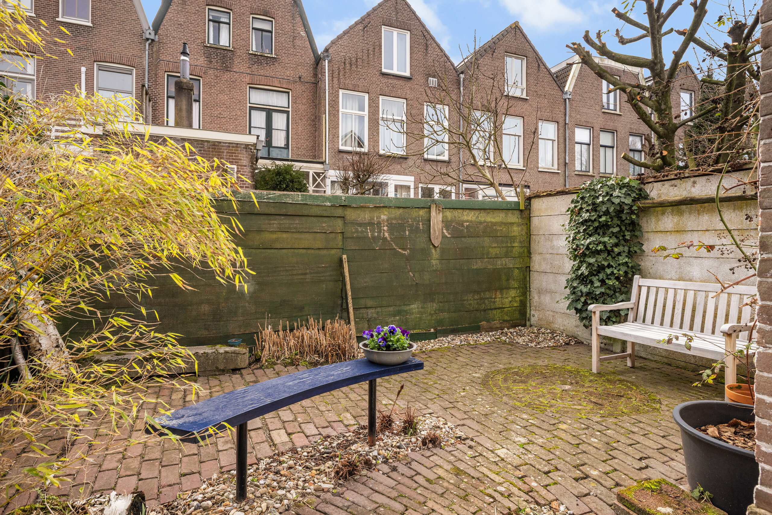 De zonnige stadstuin op het zuiden vormt een prettig en beschut buitenverblijf.