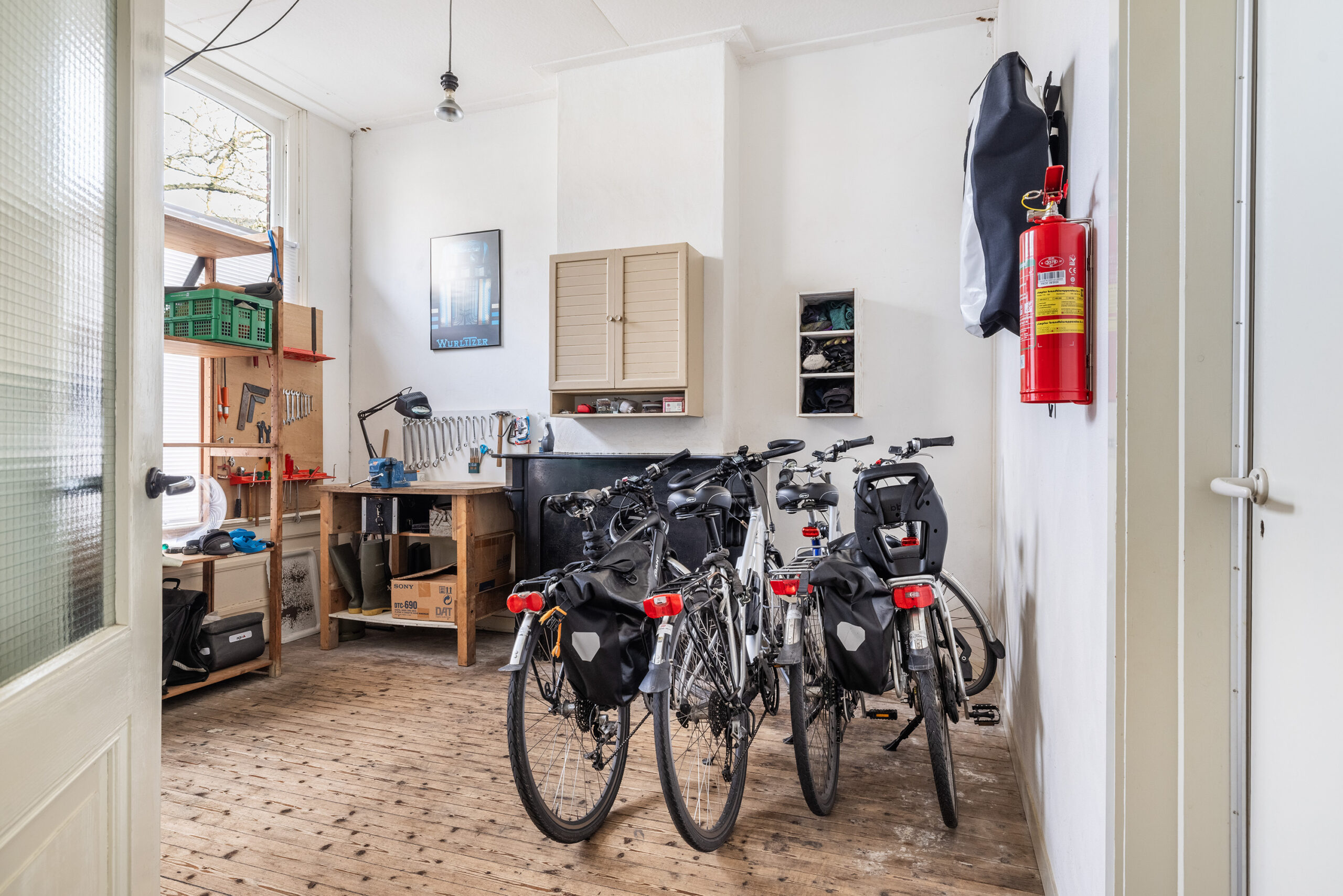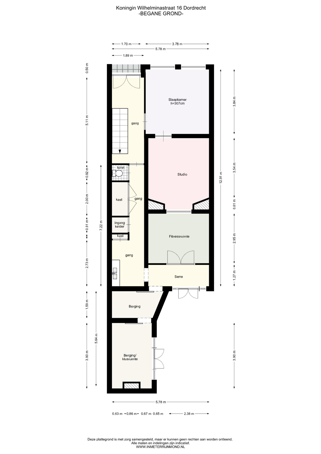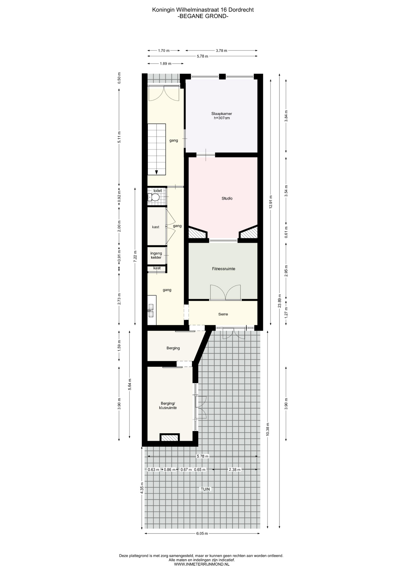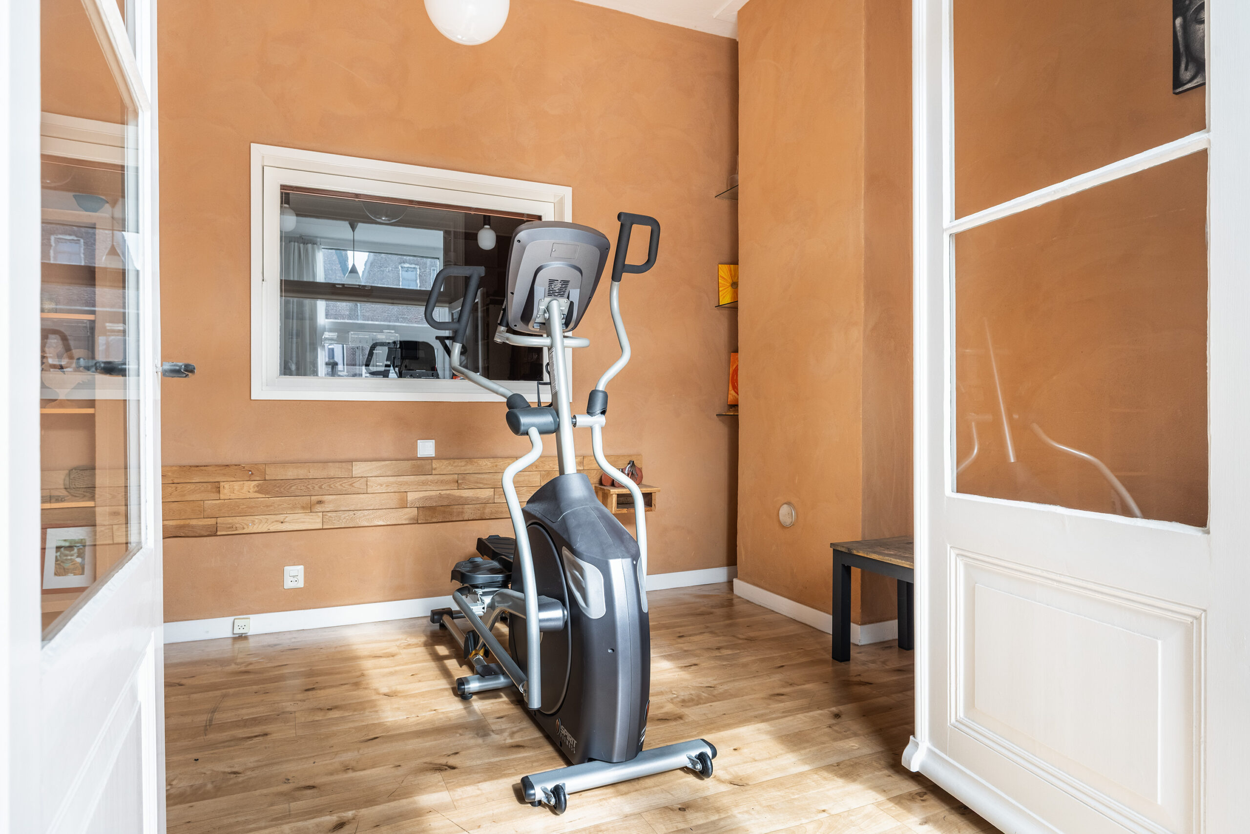 De serre is voorzien van een vloer met karakteristieke, gekleurde tegeltjes en geeft toegang tot de zonnige achtertuin, de fitnessruimte en de aansluitende studio. Deze ruimten zijn multifunctioneel en geschikt voor diverse doeleinden (bijv. werken, hobby of gastenverblijf). Tevens is vanuit de serre de inpandige berging bereikbaar.