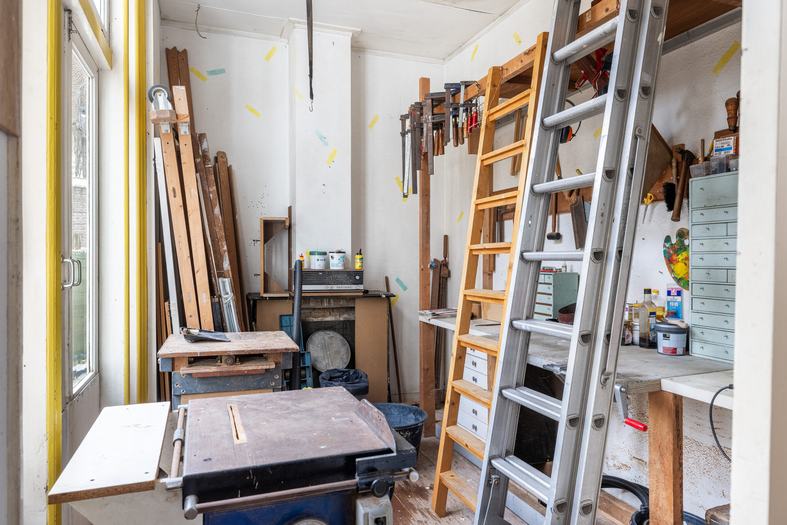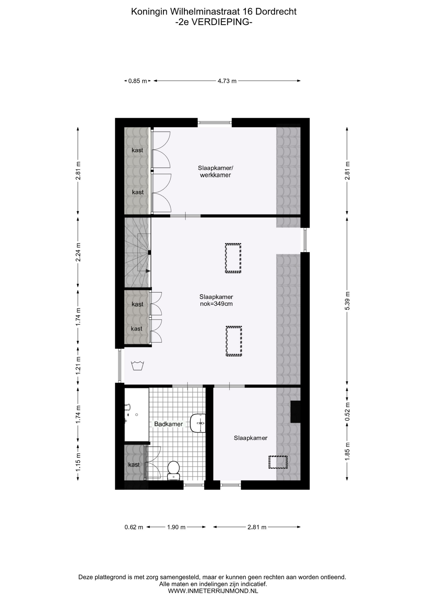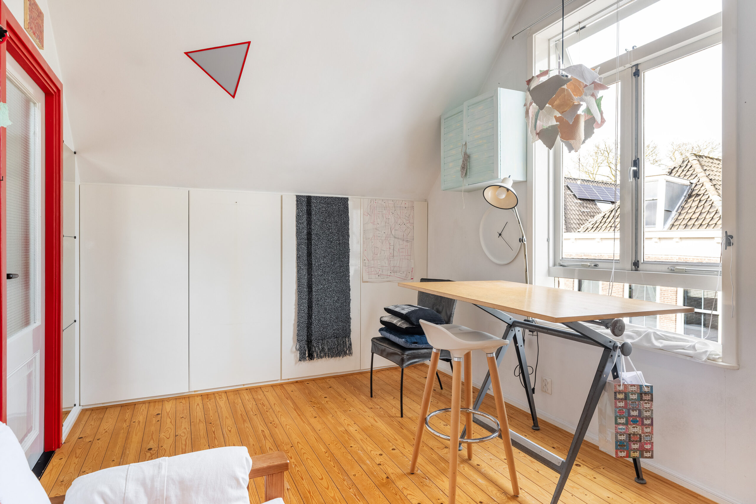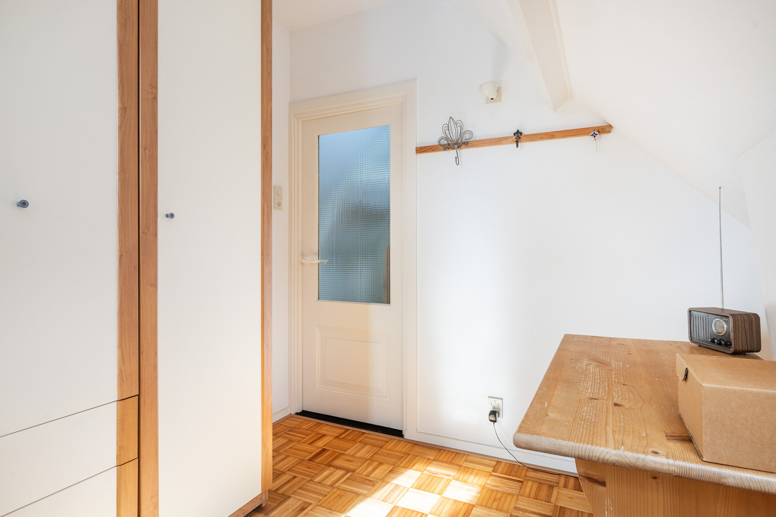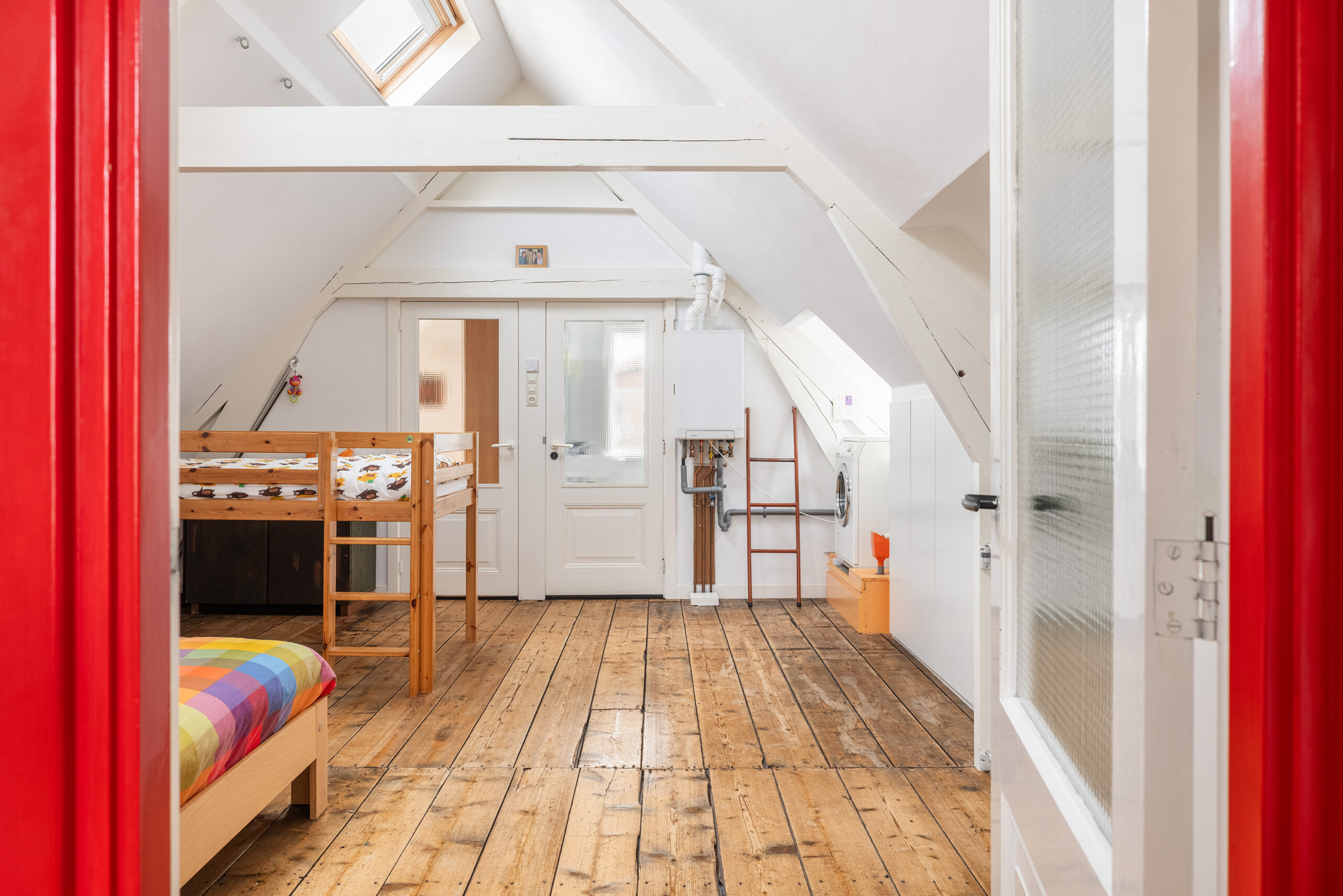 Slaapkamer 3 (midden) met dakramen, vaste kasten en aansluiting voor de wasmachine.