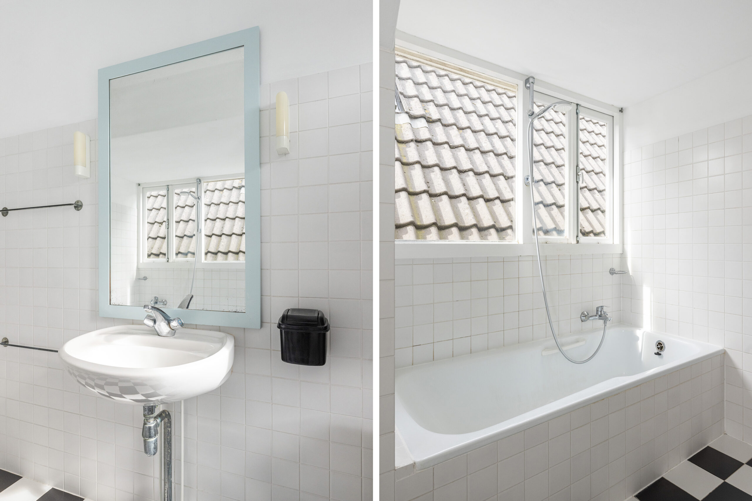 Badkamer met zwart-witte tegelvloer en deels wit betegelde wanden, uitgerust met een wastafel, ligbad, toilet en vaste kast.