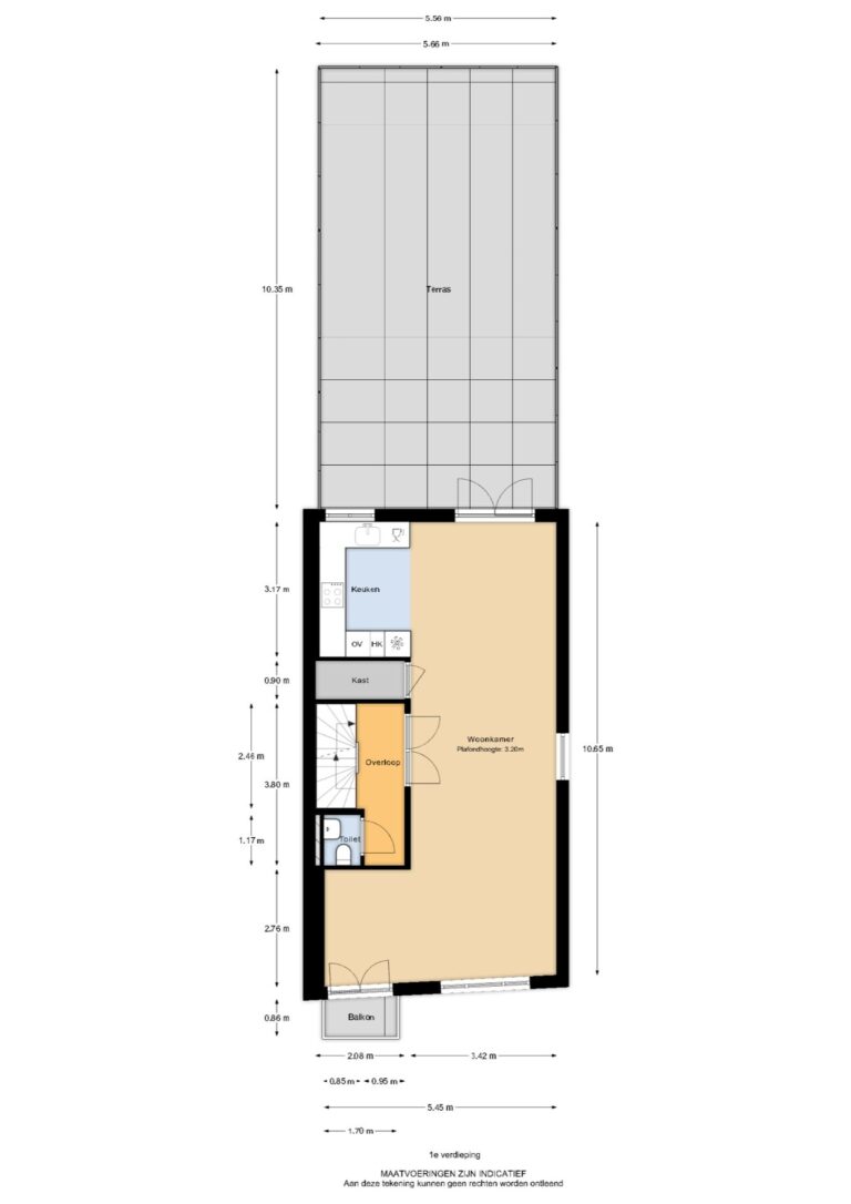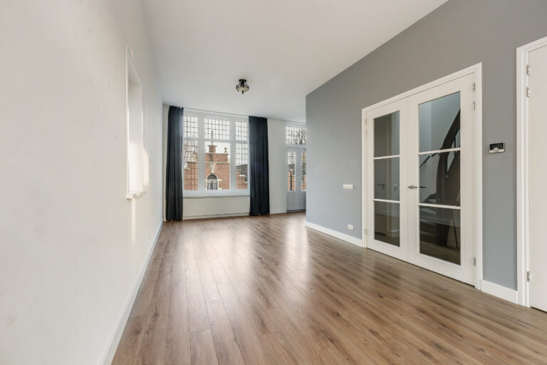 Woonkamer: De ruime woonkamer heeft een laminaatvloer, hoge plafonds, een ruime opbergkast, een toilet en biedt via de hal toegang tot de trapopgang naar de tweede verdieping.