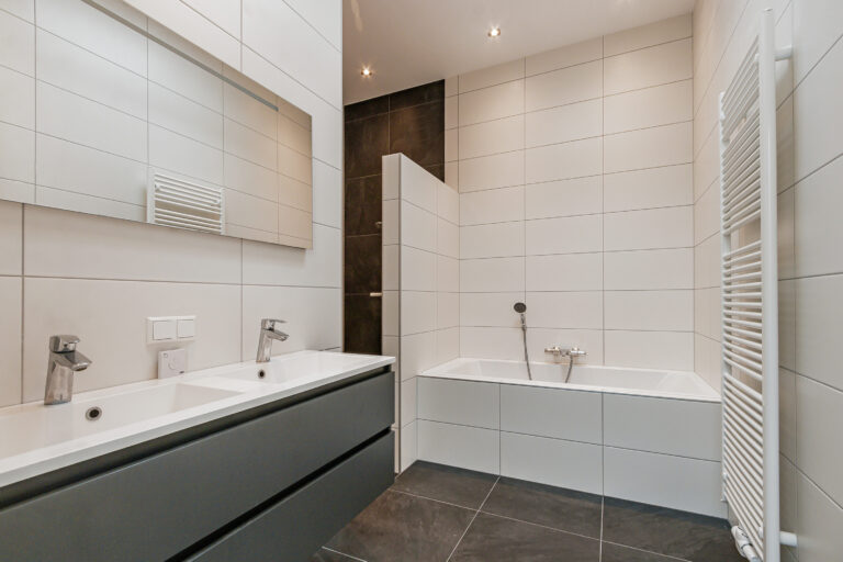 Badkamer: De volledig betegelde badkamer heeft een frisse en moderne uitstraling door het gebruik van lichte tegels. De badkamer is van hoogwaardige kwaliteit en beschikt over vloerverwarming, een dubbele wastafel, een ligbad en een inloopdouche.