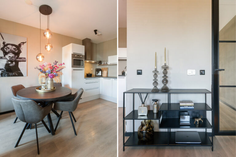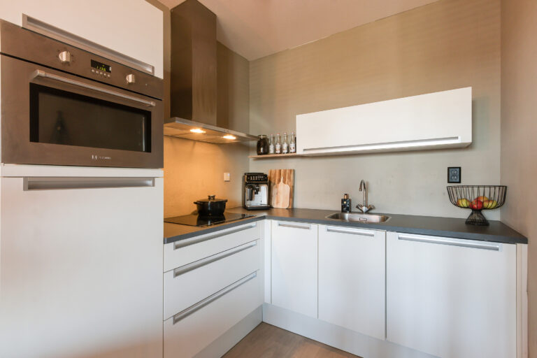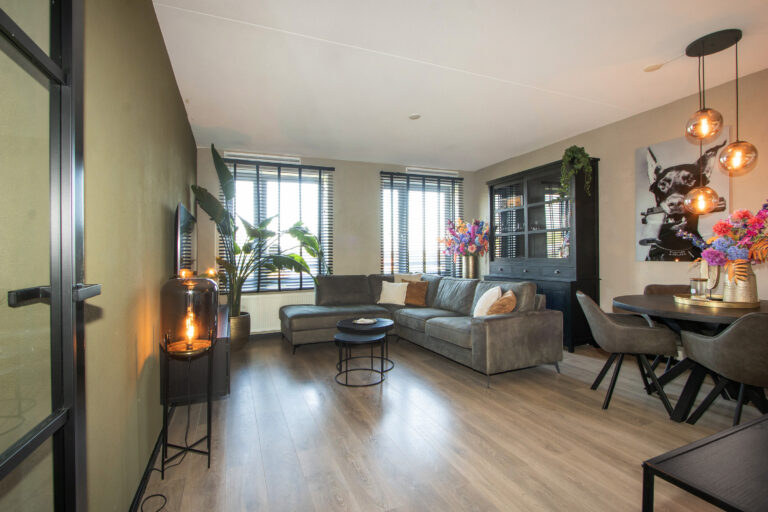 Woonkamer: Lichte sfeervolle woonkamer met laminaatvloer en strakke wanden. Open keuken met kookplaat, afzuigkap, combi-magnetron, koel-vriescombinatie en vaatwasser. Fraai uitzicht over de promenade/het park.