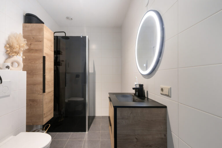 Badkamer: Nette badkamer met douche, toilet en wastafel.