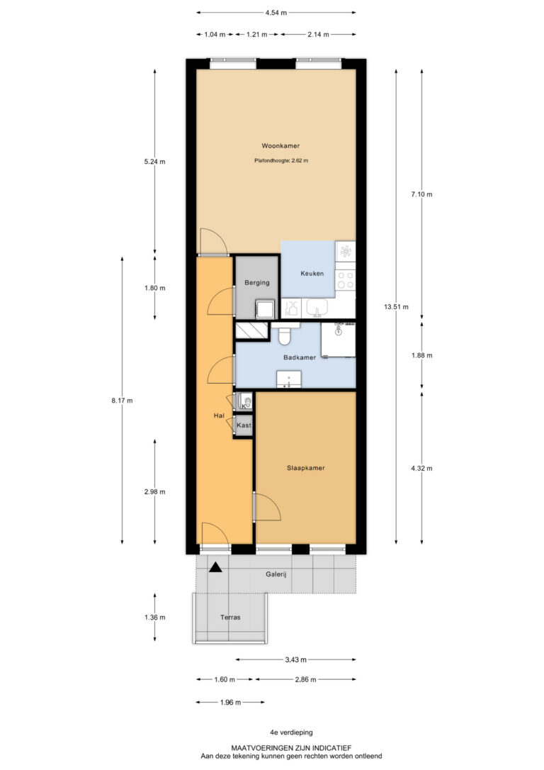 Via de galerij bereik je de voordeur van het appartement. Entree in de hal met meterkast en toegang tot alle vertrekken.