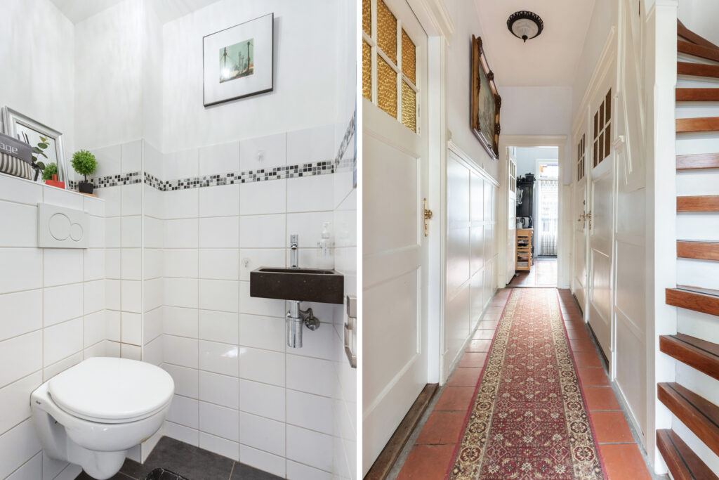 Hal met plavuizen vloer, lambrisering en trap naar eerste verdieping.