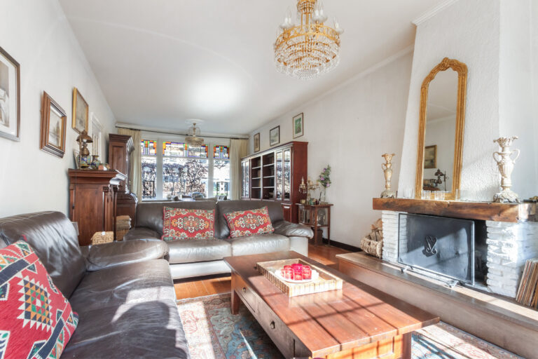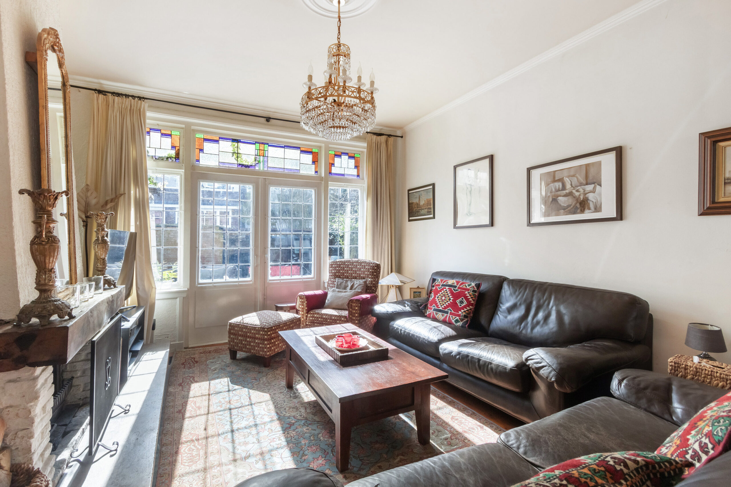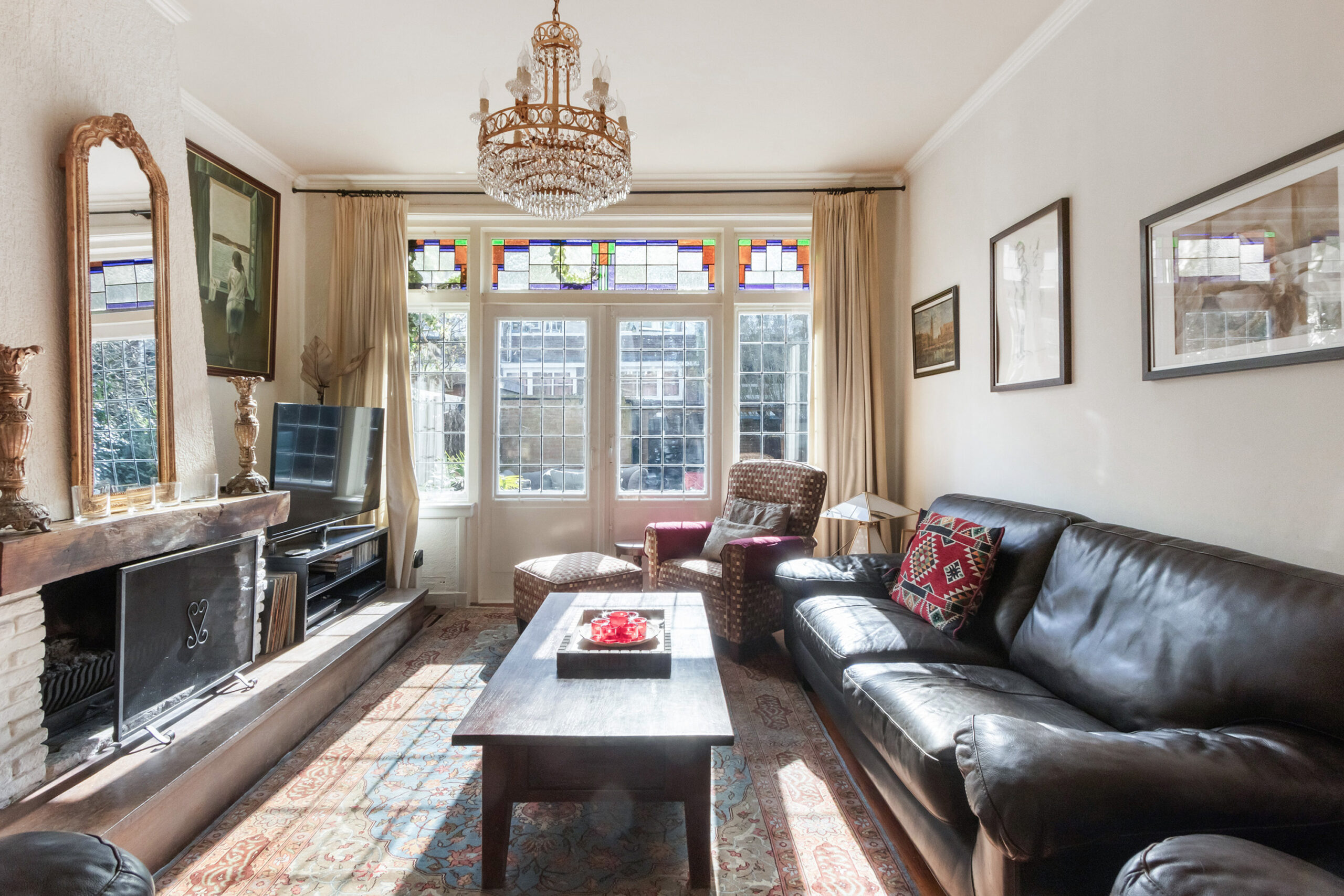 Woonkamer met open haard, originele glas-in-loodramen en openslaande deuren naar de achtertuin.