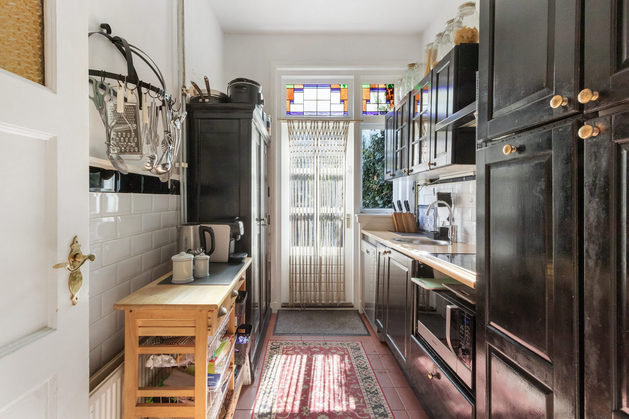 Dichte keuken met onder- en bovenkasten, spoelbak, afzuigkap, gaskookplaat (2020), combimagnetron (2020), koelkast (2018) en vaatwasser (2020). Plavuizen vloer, gedeeltelijk betegelde wanden en deur naar de achtertuin.
