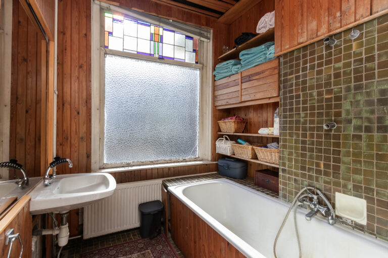 Badkamer met houten wandbetimmering, ligbad, wastafel en vloertegels (verouderd, vervanging gewenst).