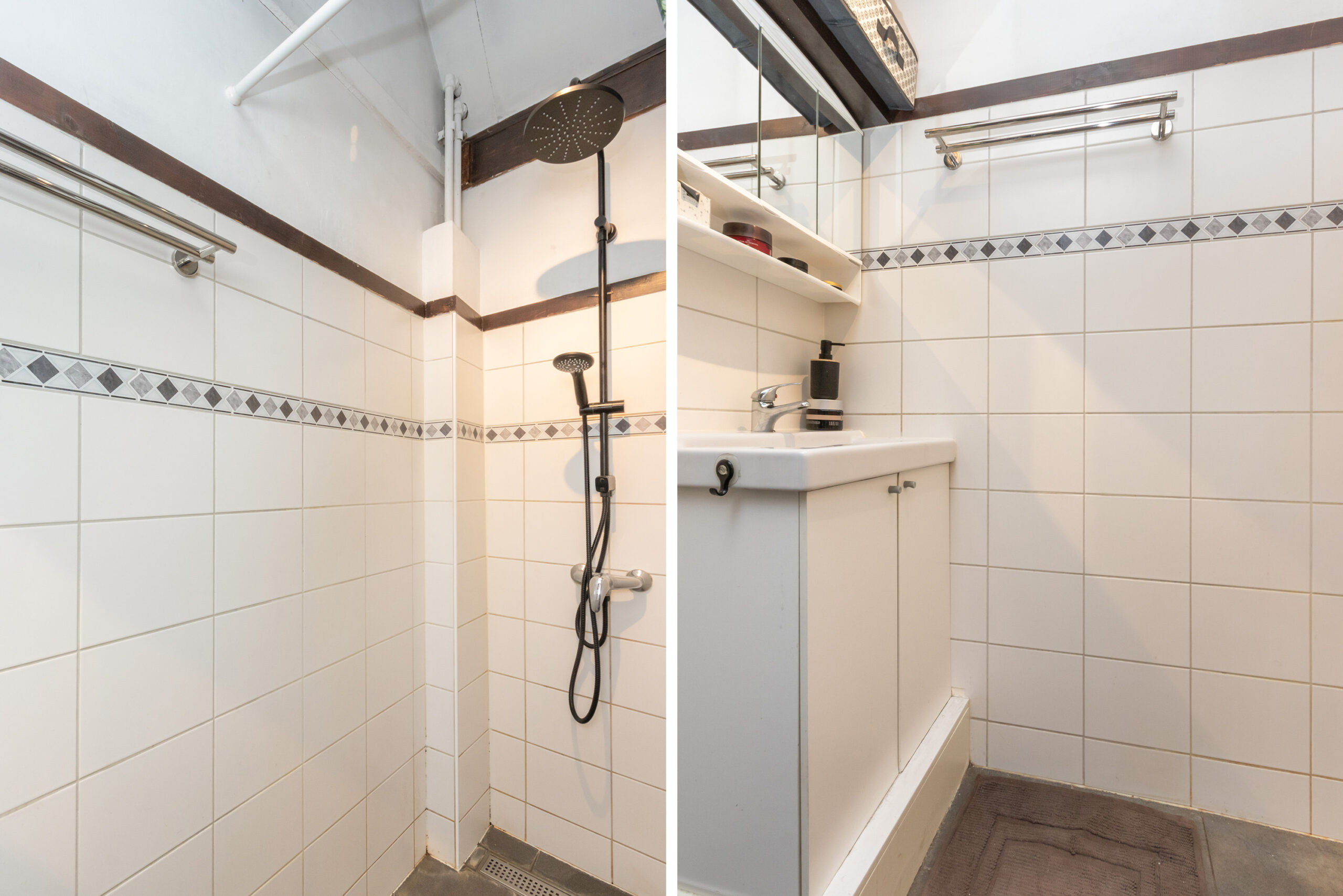 Voorzolder met dakkapel, CV-ketel (Remeha 2023), wasmachineaansluiting en hoek met wastafel en douche.