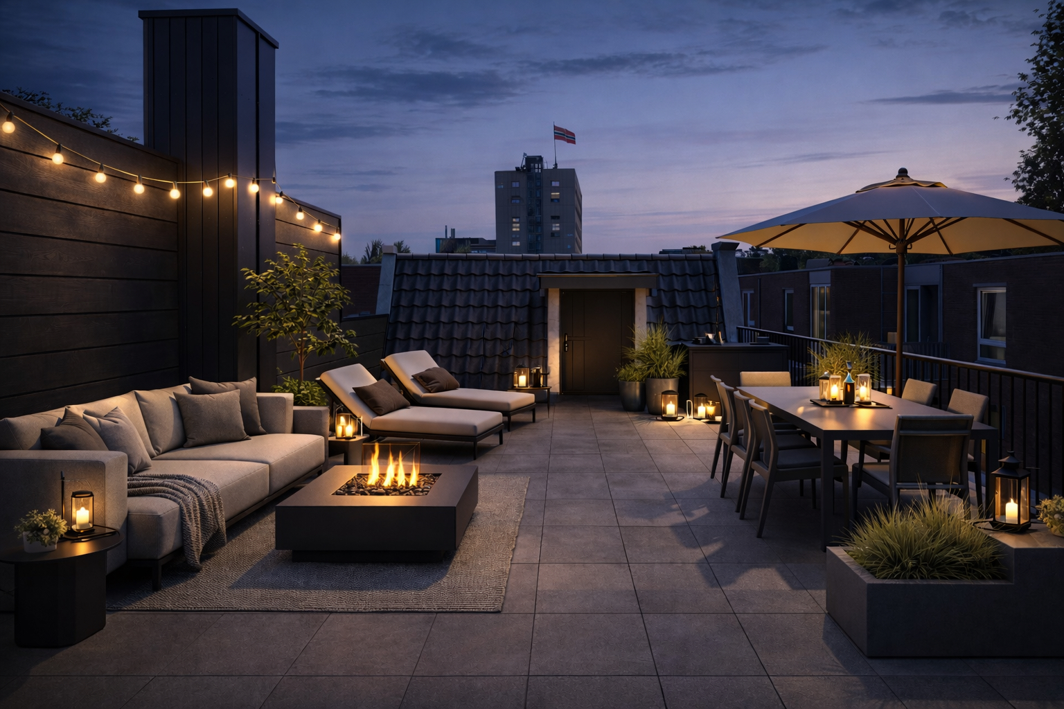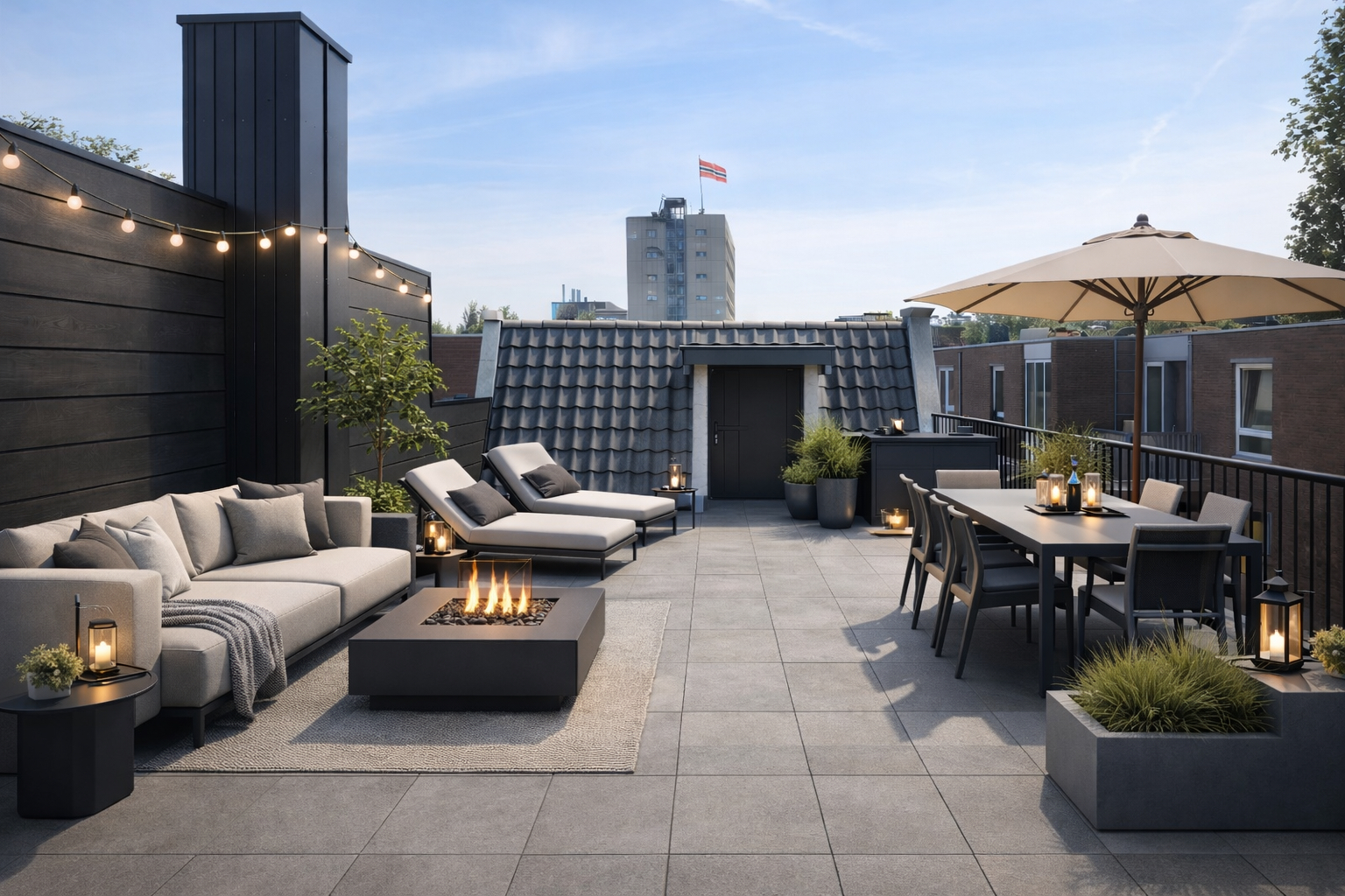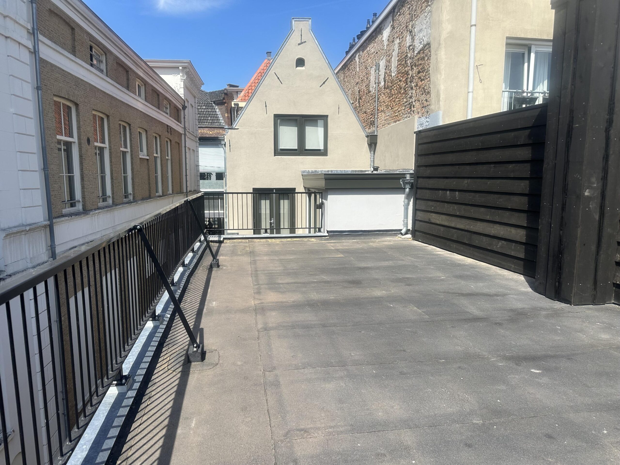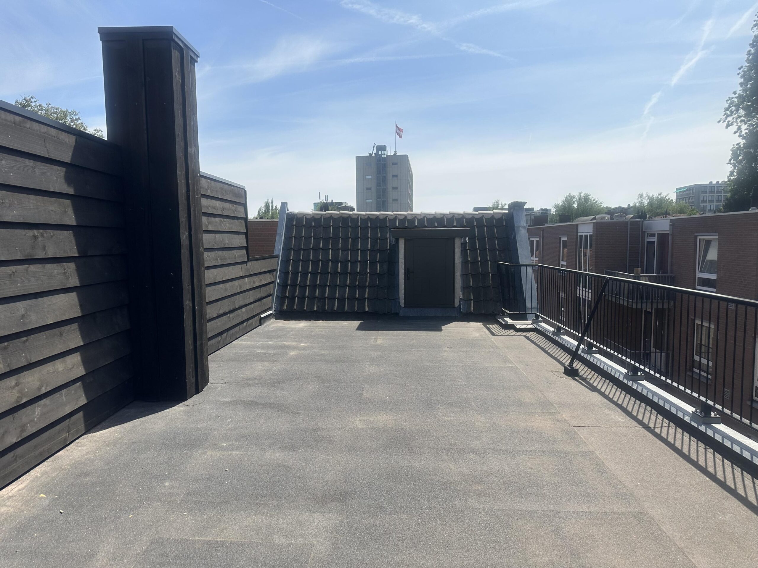 - Dakterras met nieuwe balustrade en gepotdekselde afscheiding.