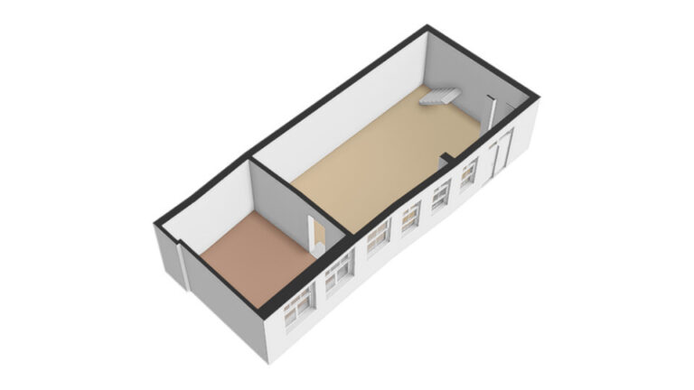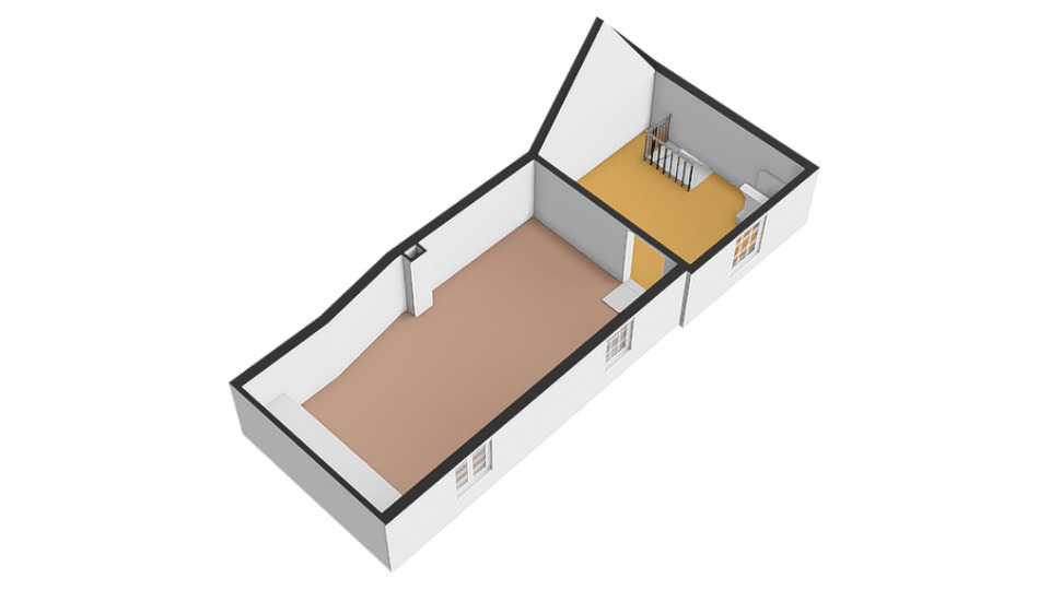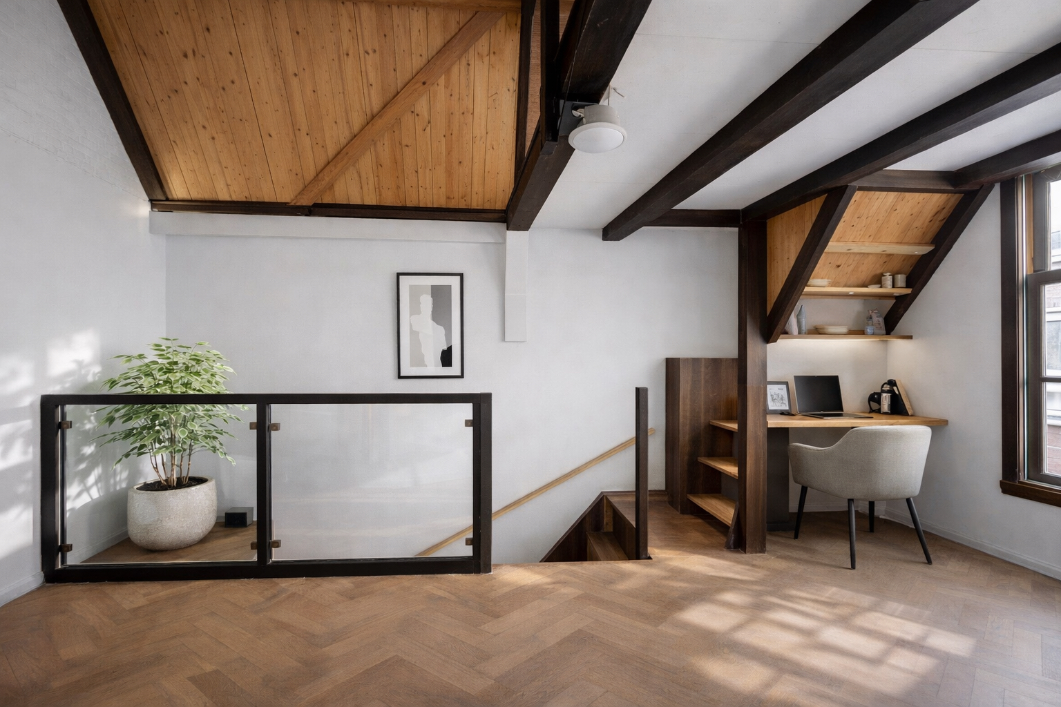 - Verdieping: open ruimtes, trap naar vide.