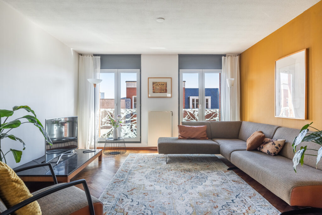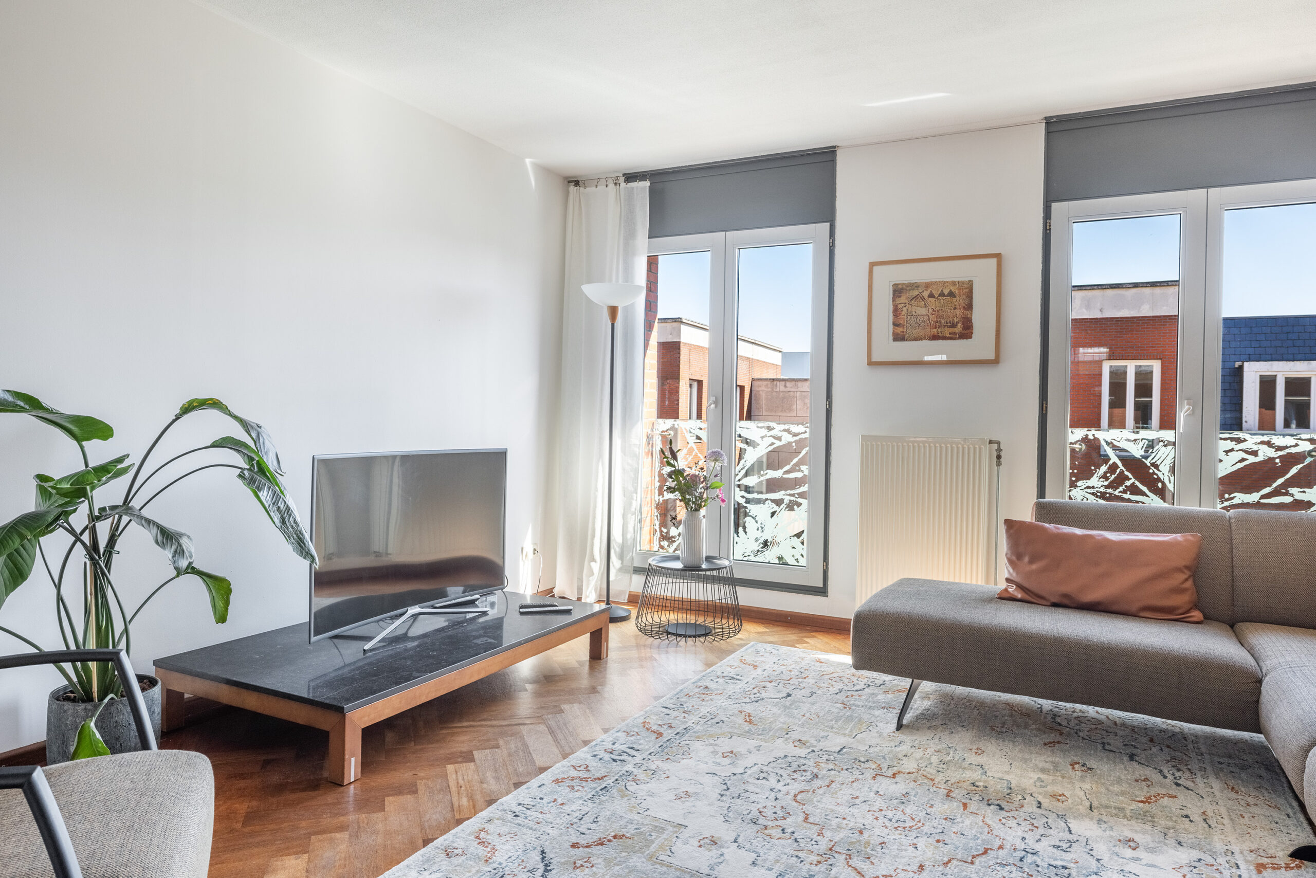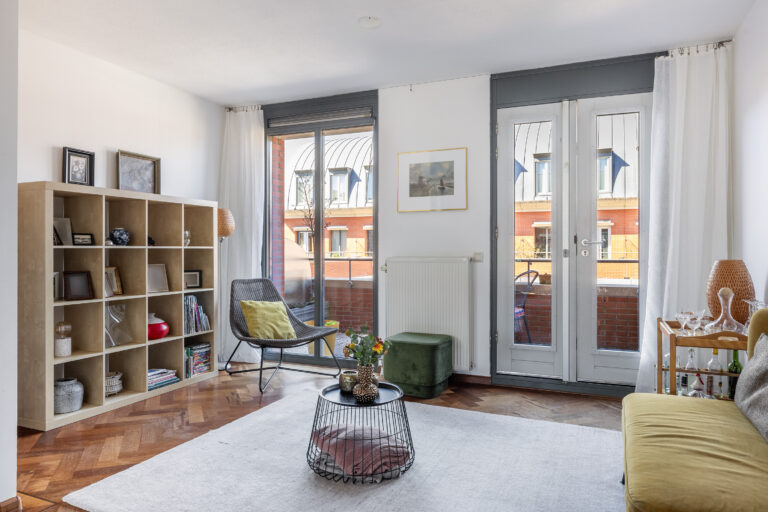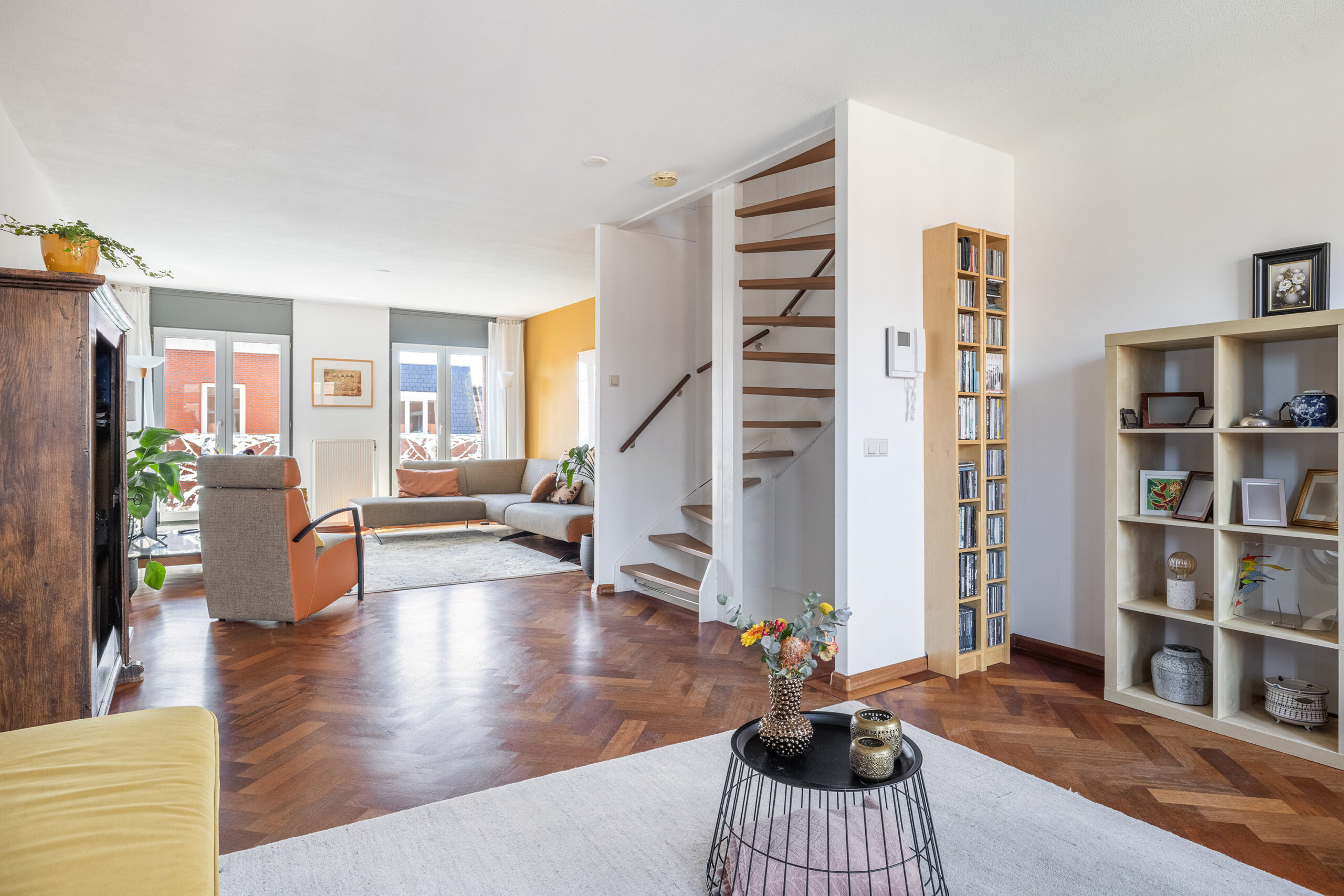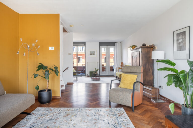Woonkamer met parketvloer in visgraatmotief met bies. Aan de voorzijde twee Franse balkons. Aan de achterzijde openslaande deuren naar het pandbrede balkon.
