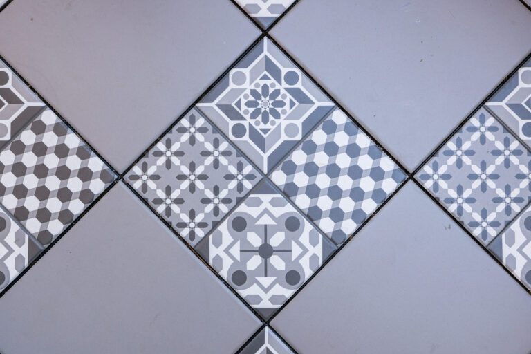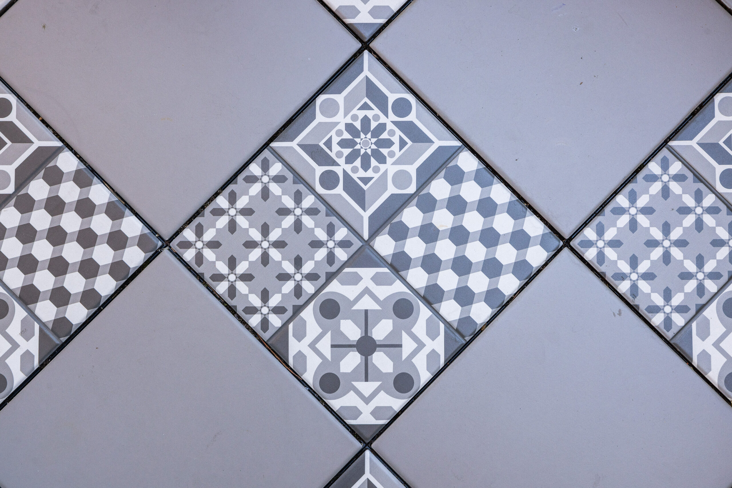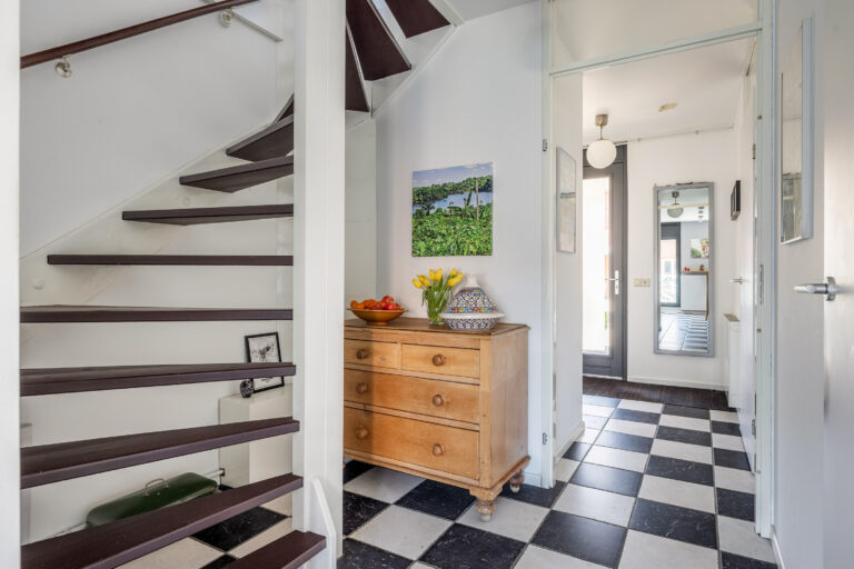 L-vormige gang met plavuizenvloer, op maat gemaakte kokosmat, trapopgang en meterkast.