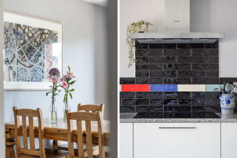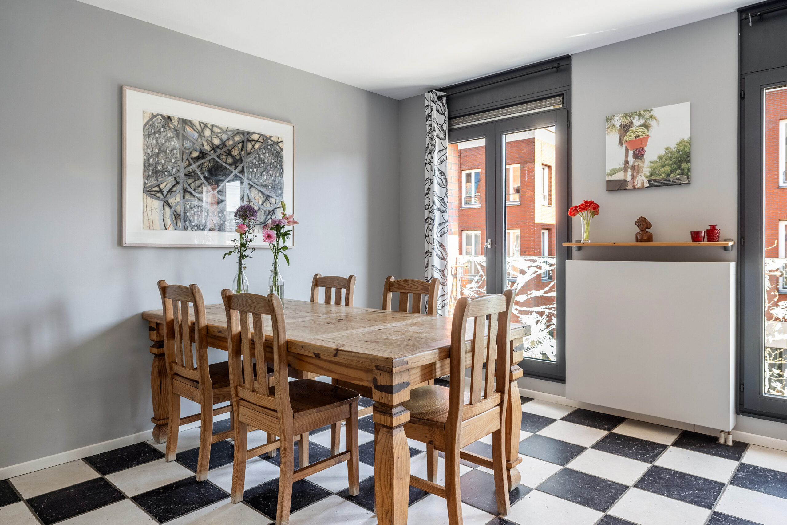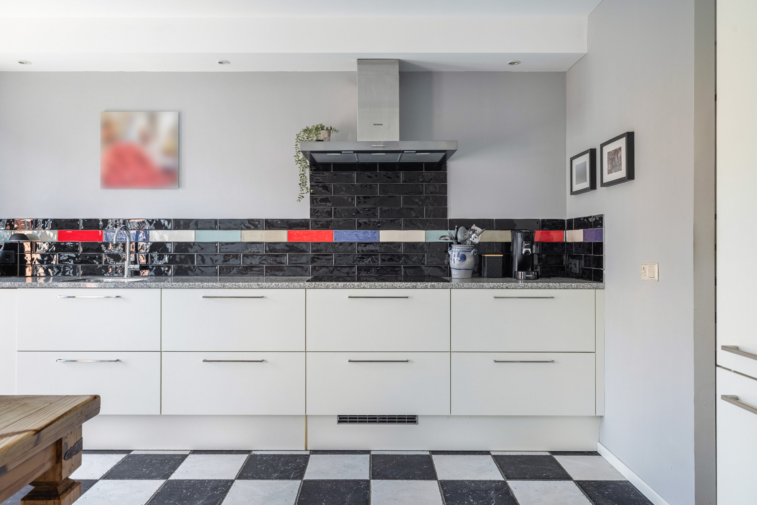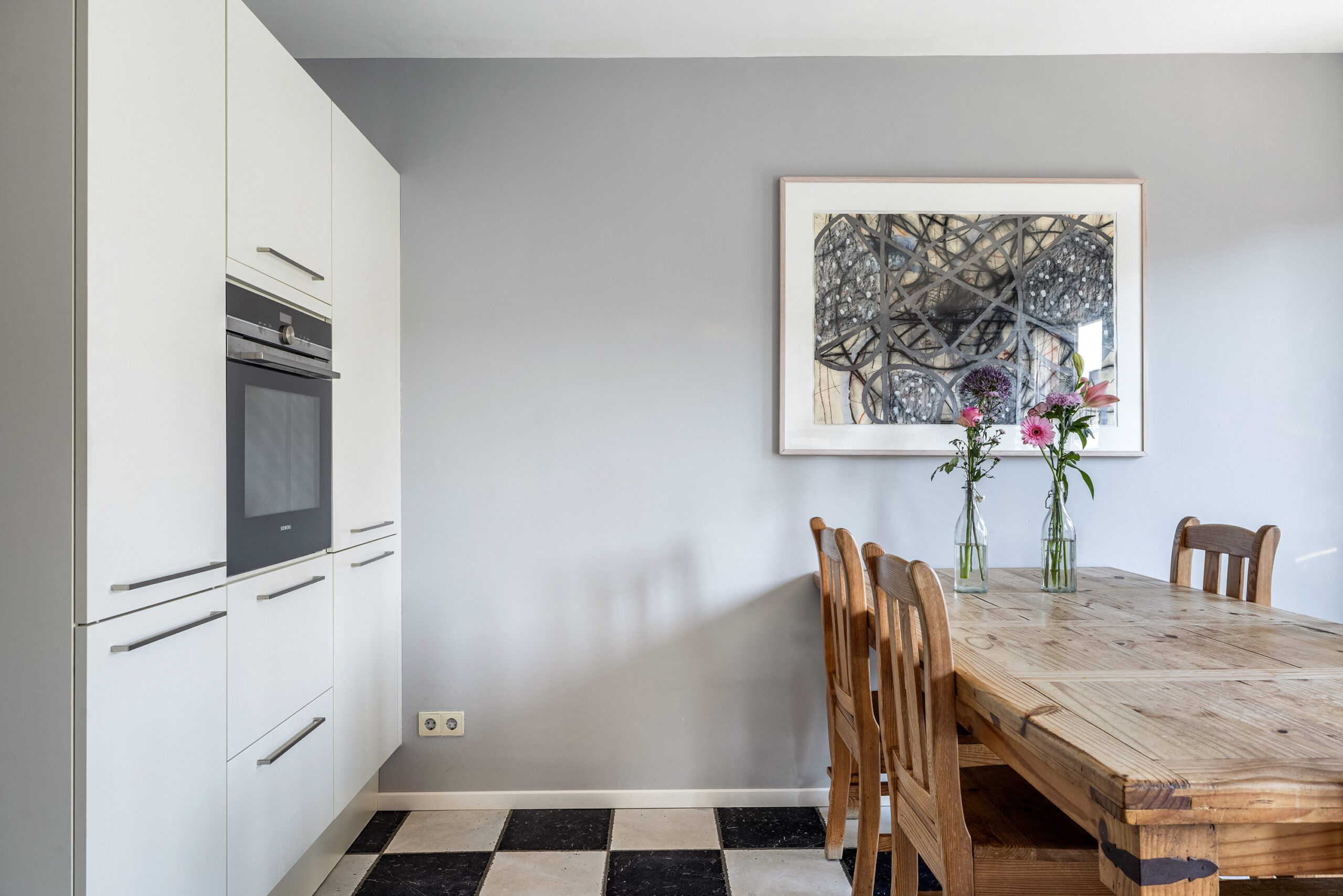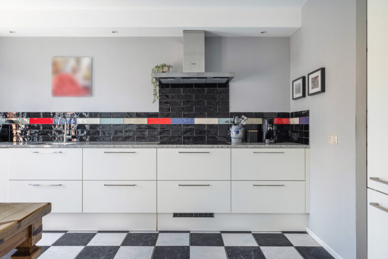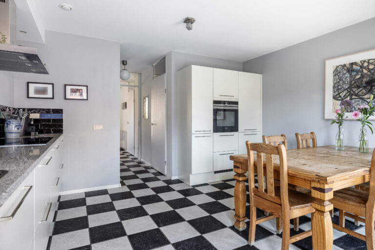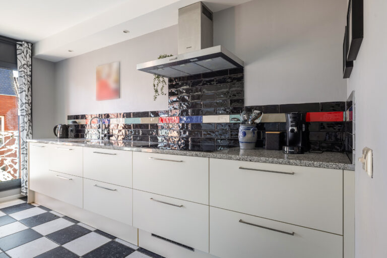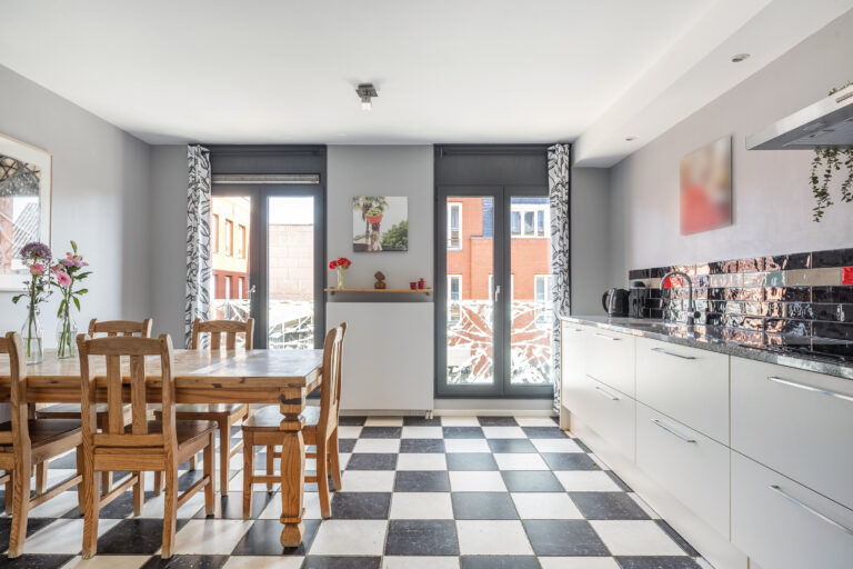 Woonkeuken (2018) met zwart-witte tegelvloer, twee Franse balkons en radiatorombouw. De keuken is uitgevoerd in rechte opstelling en voorzien van spoelbak, inductiekookplaat, afzuigkap en vaatwasser. Daarnaast een hoge kastenwand met inbouwapparatuur, waaronder een koel-/vriescombinatie en oven.