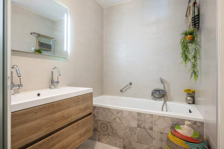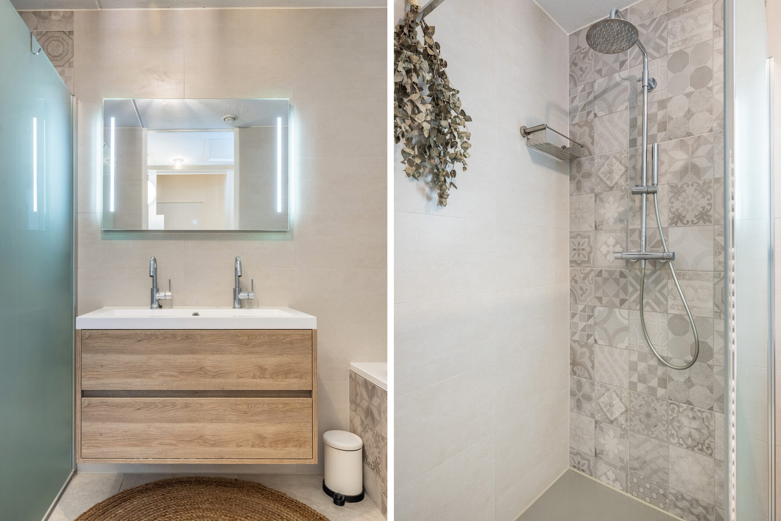 Badkamer (2022), volledig betegeld en voorzien van inloopdouche met thermostaatkraan, ligbad en wastafelmeubel met dubbele kraan.