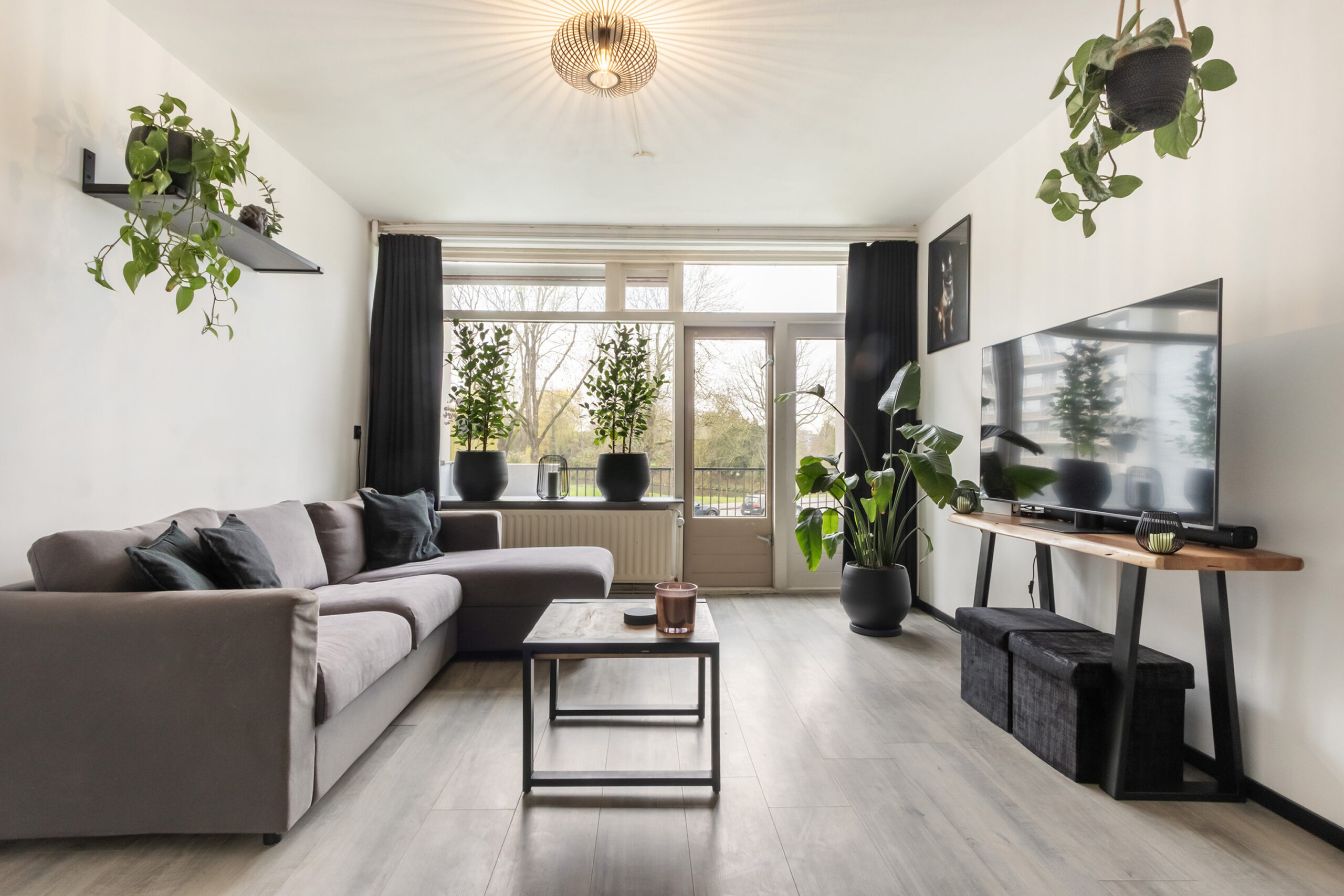 Ruime en lichte woonkamer, gelegen aan de achterzijde van het appartement. Vanuit de woonkamer is er toegang tot het balkon op het westen, waar u kunt genieten van een vrij uitzicht over het groen en de Thorbeckeweg.