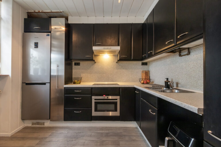 De keuken bevindt zich aan de voorzijde en is uitgevoerd in een praktische hoekopstelling met boven- en onderkasten. Voorzien van diverse inbouwapparatuur, waaronder een inductiekookplaat met afzuigkap, combi-oven en een koel-/vriescombinatie.