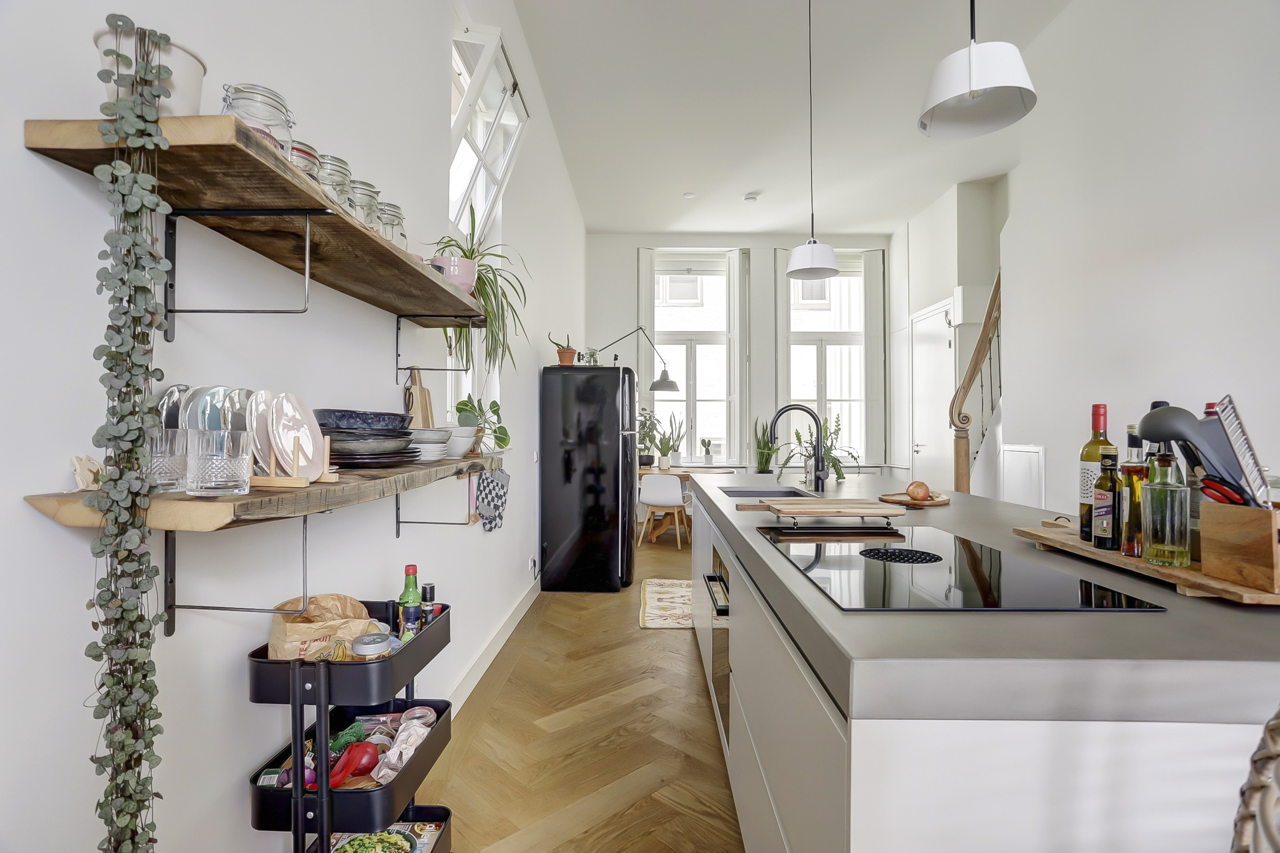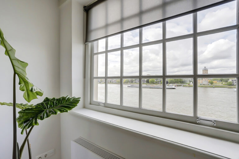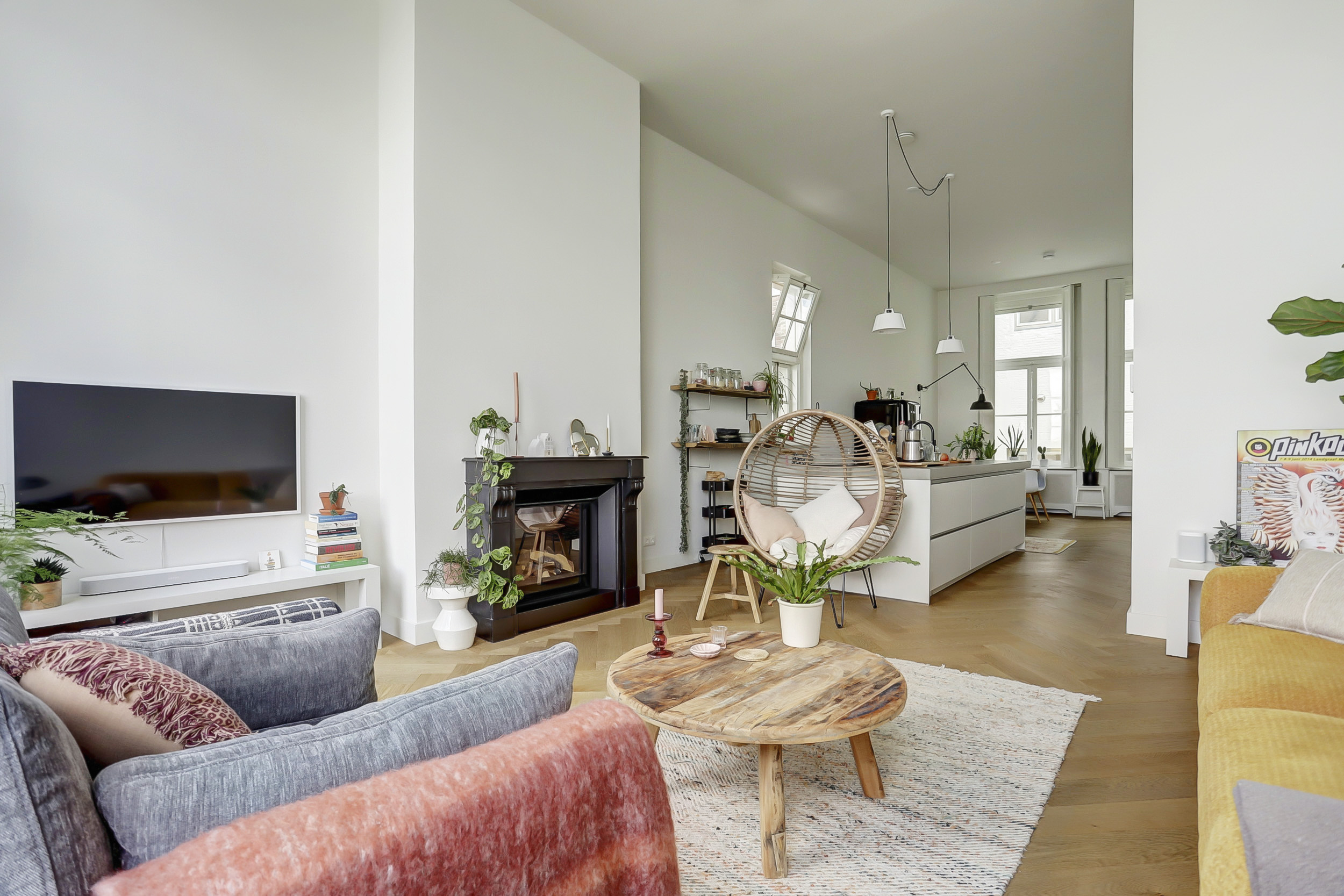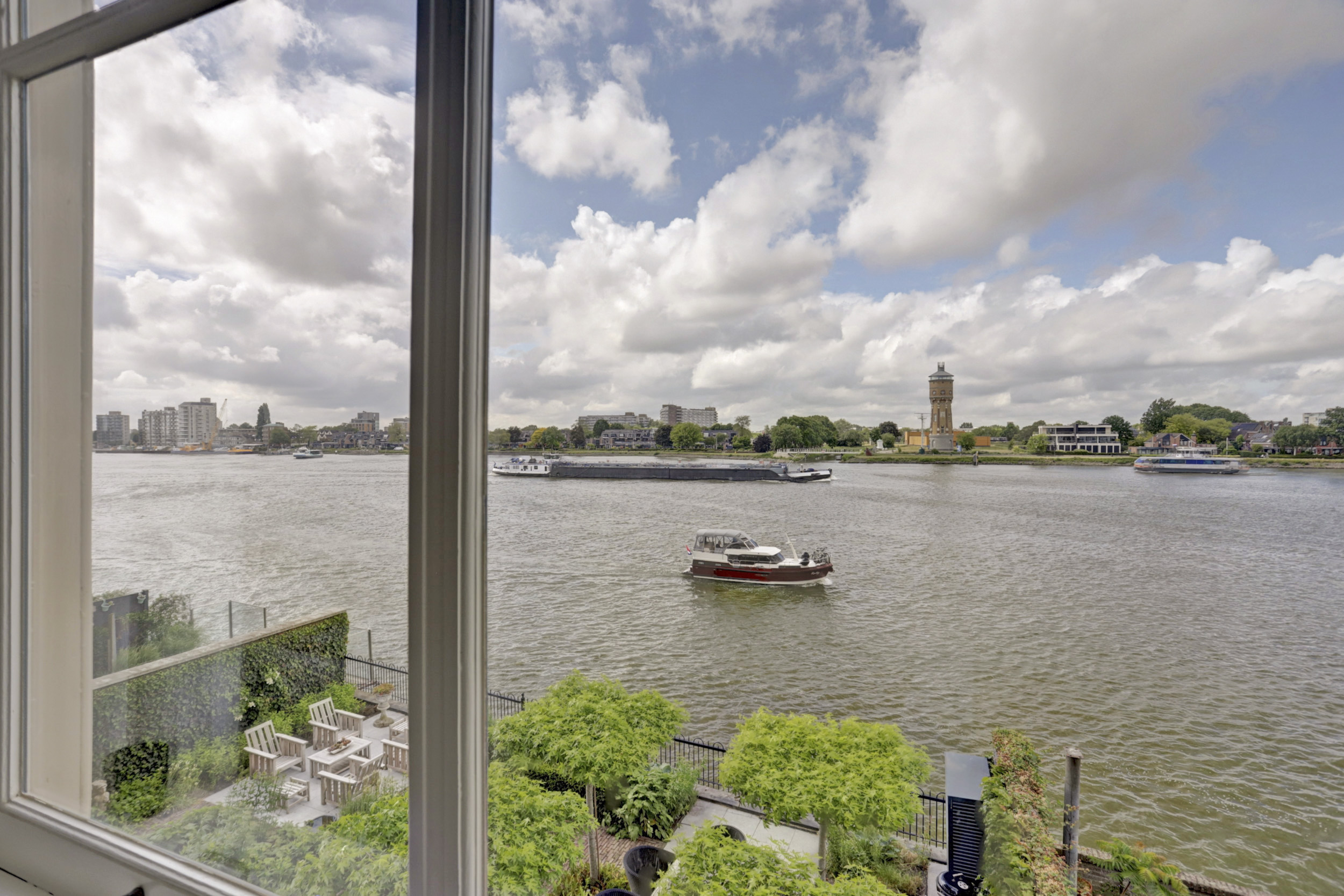 Op de eerste verdieping bevindt zich de royale en lichte woonkamer met visgraatparketvloer, die dankzij de grote ramen prachtig daglicht ontvangt en een adembenemend uitzicht biedt over de rivieren en de watertoren. Het kookeiland vormt het hart van de ruimte, met het eetgedeelte aan de ene kant en een comfortabel zitgedeelte aan de andere kant. De moderne keuken is voorzien van hoogwaardige apparatuur, waaronder een kookplaat met Bora-afzuiging, stoomoven, Quooker en vaatwasser. De sfeervolle gashaard en klassieke schouw geven de woonkamer extra karakter, terwijl de monumentale trap een elegante verbinding vormt naar de slaapverdieping. Originele paneelluiken aan de patiozijde ronden het geheel af en versterken de monumentale charme van het appartement.