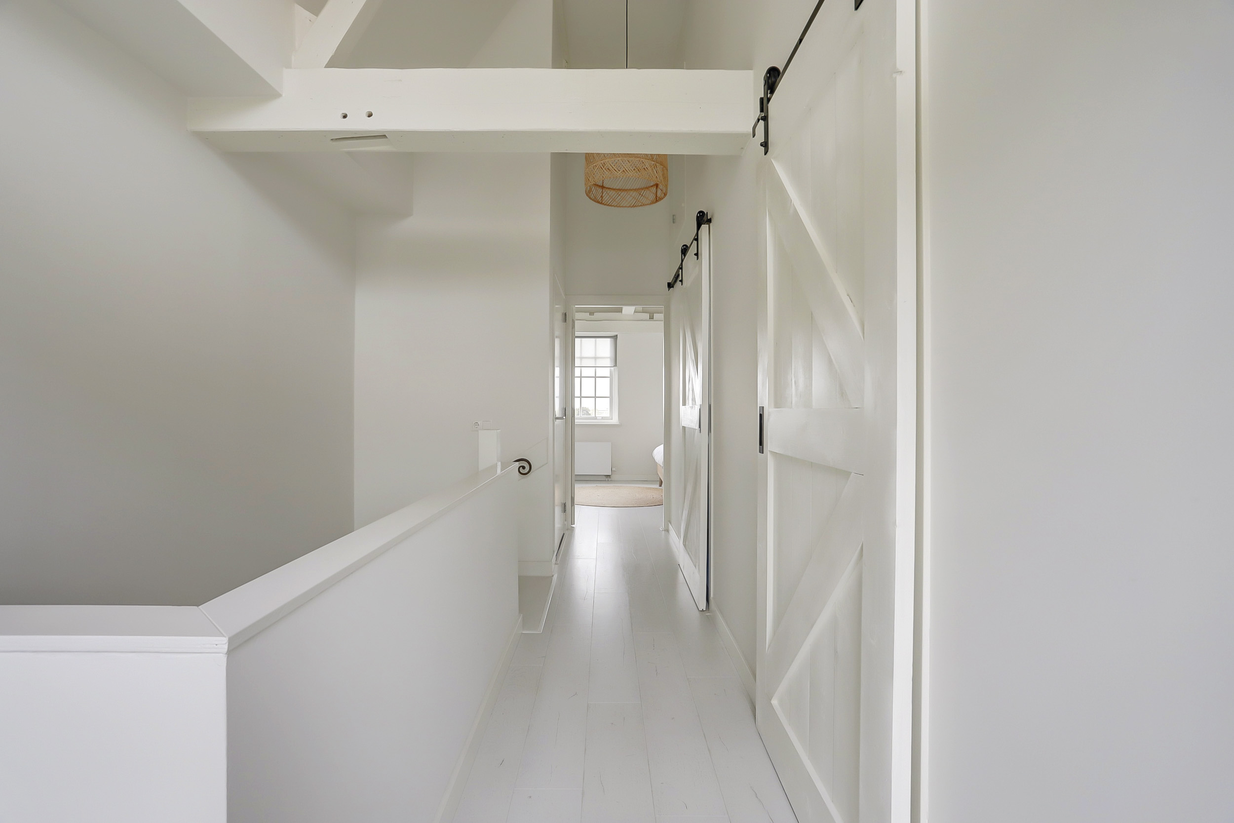 Op de tweede verdieping bevinden zich twee comfortabele slaapkamers, beide voorzien van een lichte laminaatvloer. De moderne badkamer is uitgerust met een inloopdouche, toilet en een stijlvolle waskom. Alles is uitgevoerd in lichte kleurstellingen met stoere zwarte elementen, wat zorgt voor een eigentijdse uitstraling. Extra bergruimte is beschikbaar op de vliering, ideaal voor opslag of seizoensgebonden spullen.
