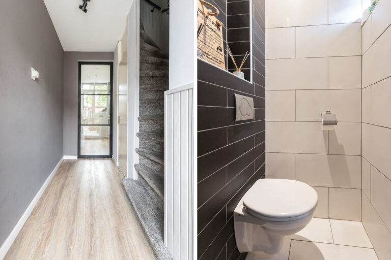 De toiletruimte is modern betegeld in wit en zwart en voorzien van hangend sanitair.