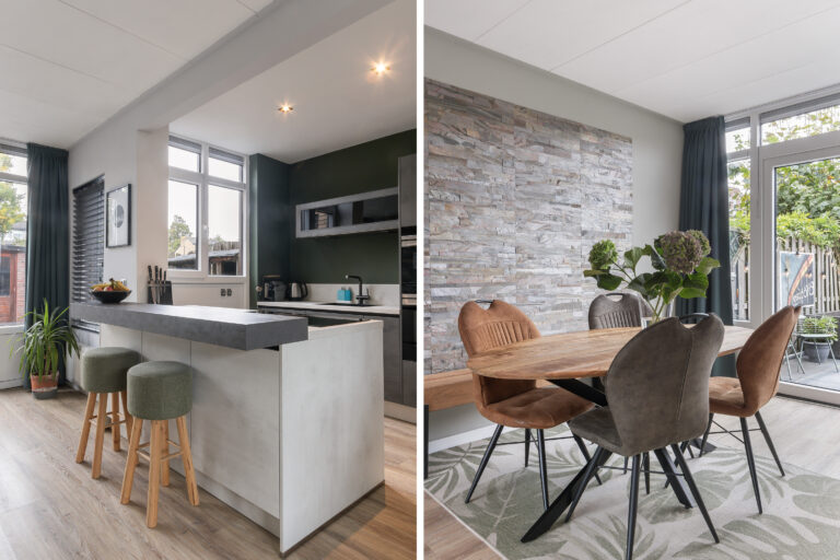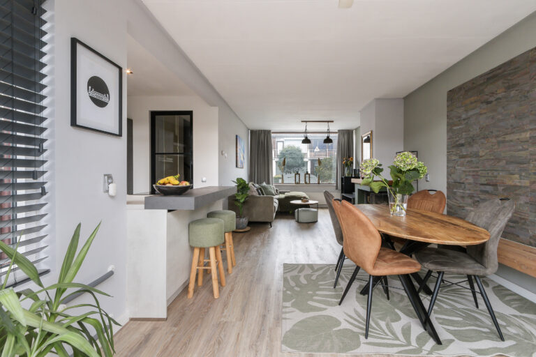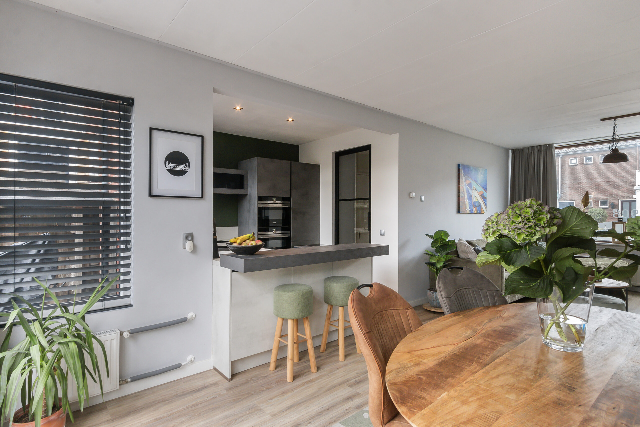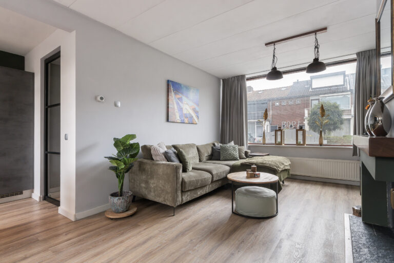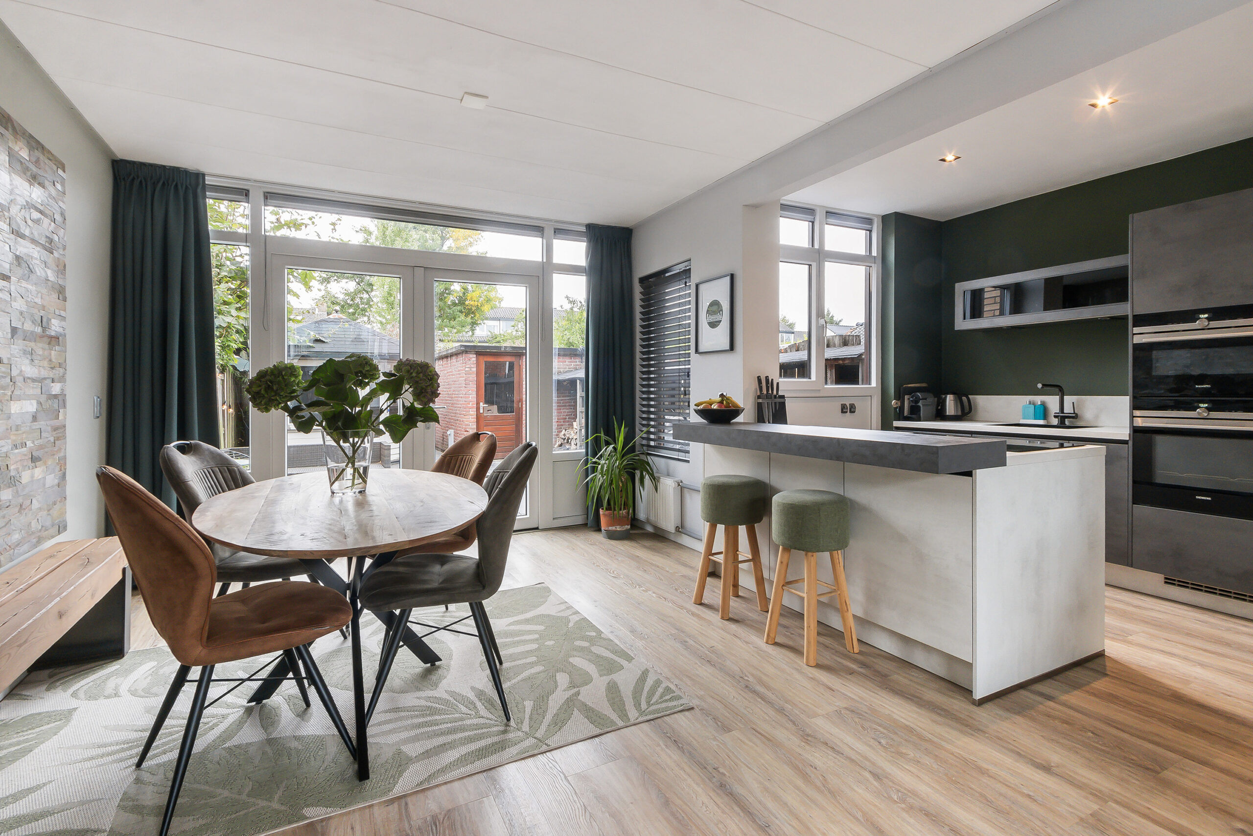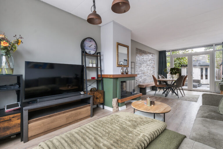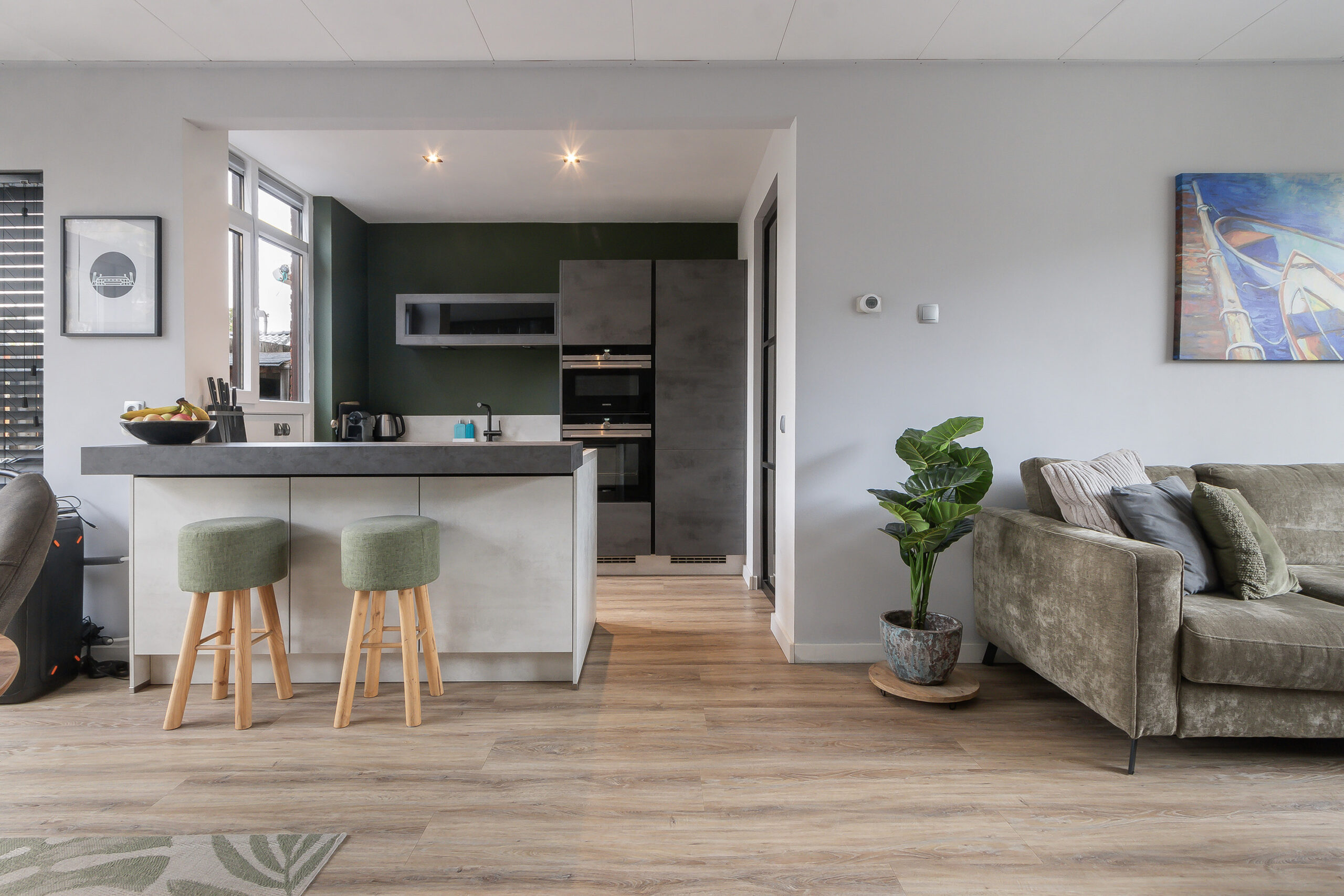De doorzonwoonkamer is sfeervol afgewerkt en voorzien van openslaande deuren aan de achterzijde, die toegang bieden tot de zonnige tuin. In 2022 is de muur tussen woonkamer en keuken doorgebroken, waardoor een royale leefruimte is ontstaan die koken en wonen combineert.