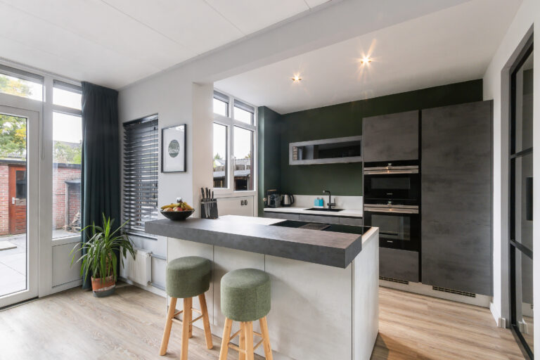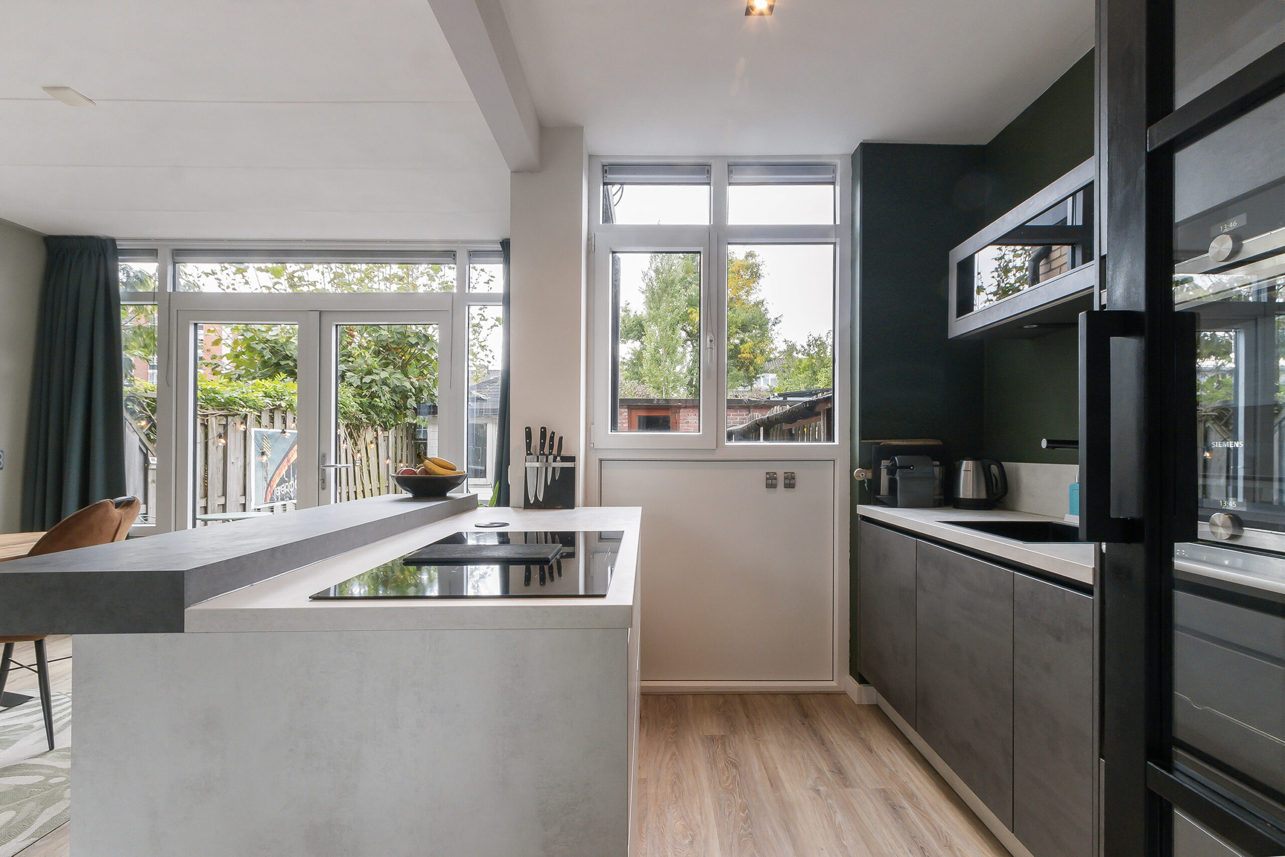 De keuken, eveneens uit 2022, is uitgevoerd in antraciet met veel opbergruimte en een kookeiland met bar. De inbouwapparatuur bestaat uit een inductiekookplaat, afzuigkap, magnetron, oven, koelkast, vriezer en vaatwasser.