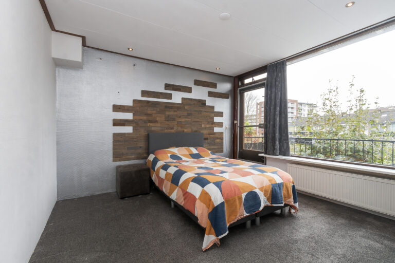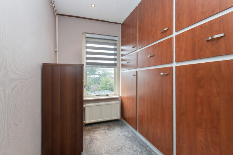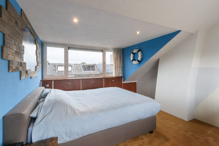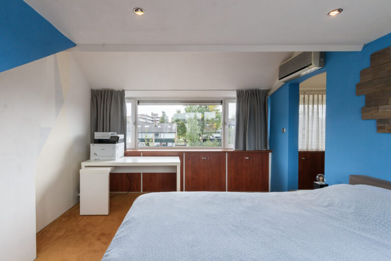 De voorzolder biedt plek voor de cv-combiketel (bouwjaar 2022), wasmachine en droger, met extra bergruimte achter knieschotten. De ruime slaapkamer is afgewerkt met nette vloerbedekking, strakke wanden, veel bergkasten, inbouwspots en airconditioning. Een rolluik bevindt zich bij de dakkapel.