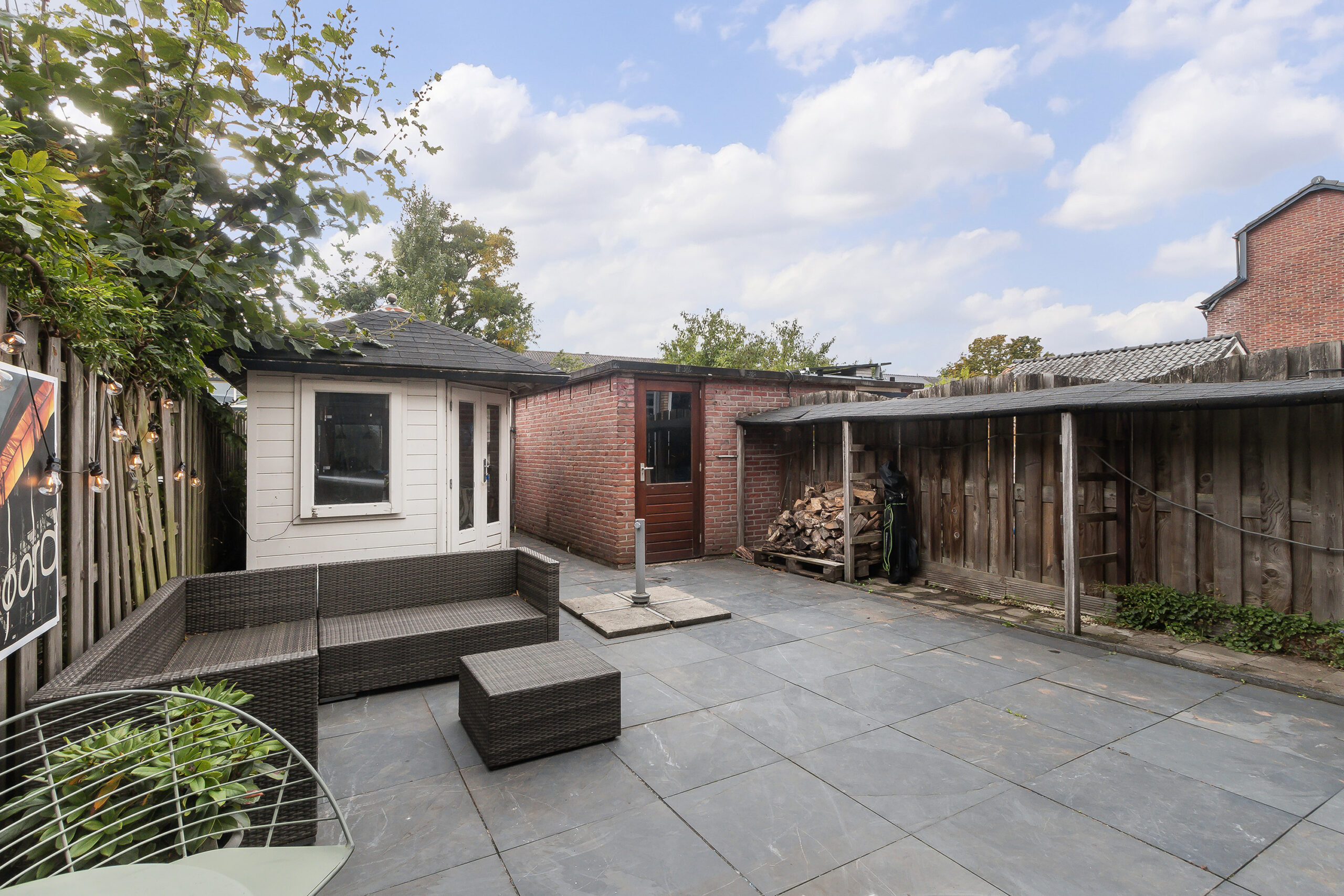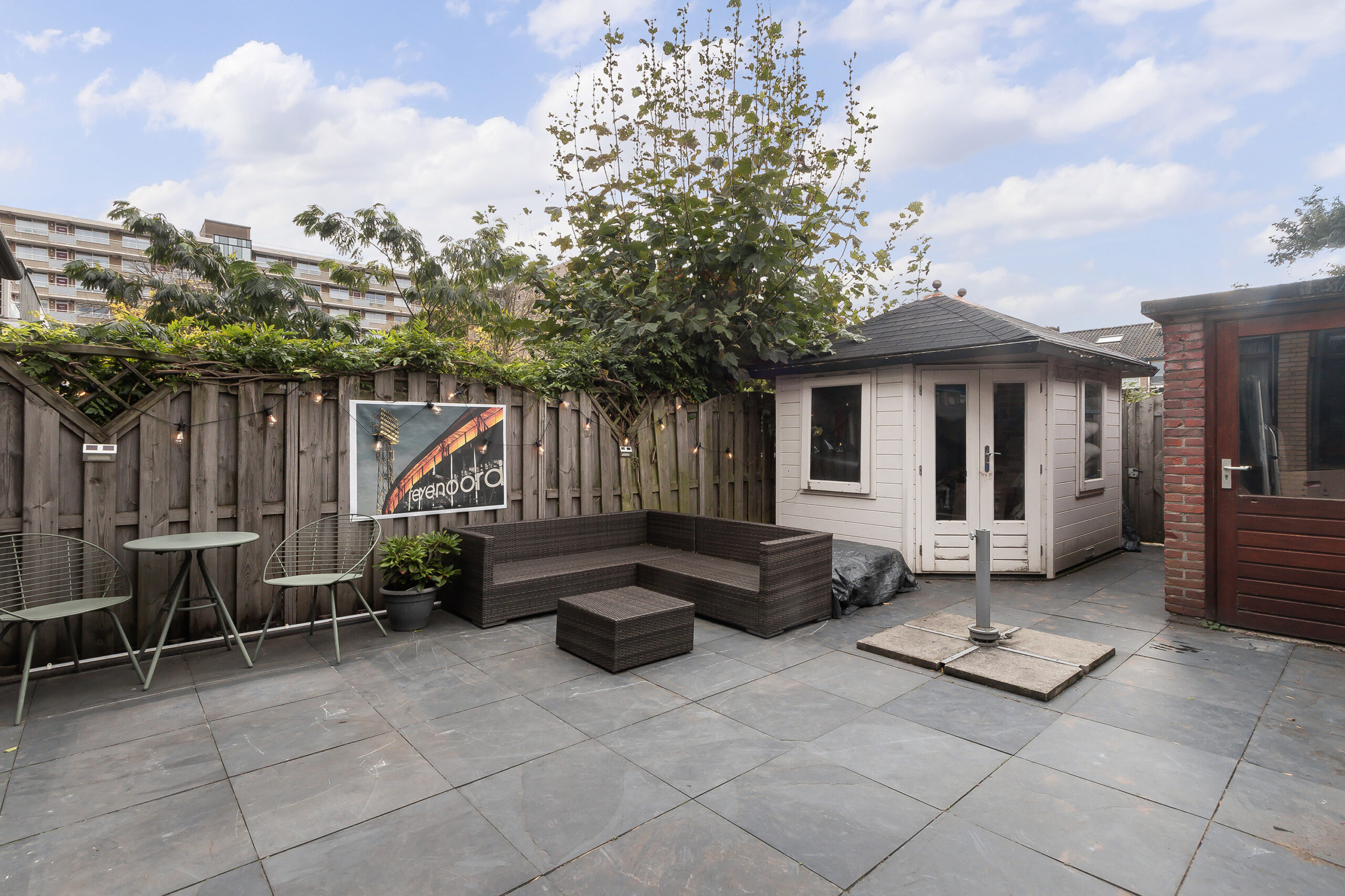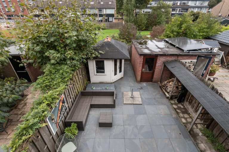 De achtertuin, gesitueerd op het zuiden, is eveneens onderhoudsvriendelijk aangelegd met antraciet tegels. Hier staat naast de stenen berging een fraai houten chalet voor extra opslag, beide voorzien van elektra.