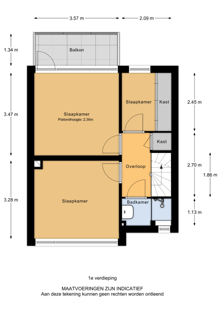 Op de eerste verdieping bevinden zich drie slaapkamers, de badkamer en een handige bergkast. Alle kamers zijn voorzien van nette vloerbedekking.