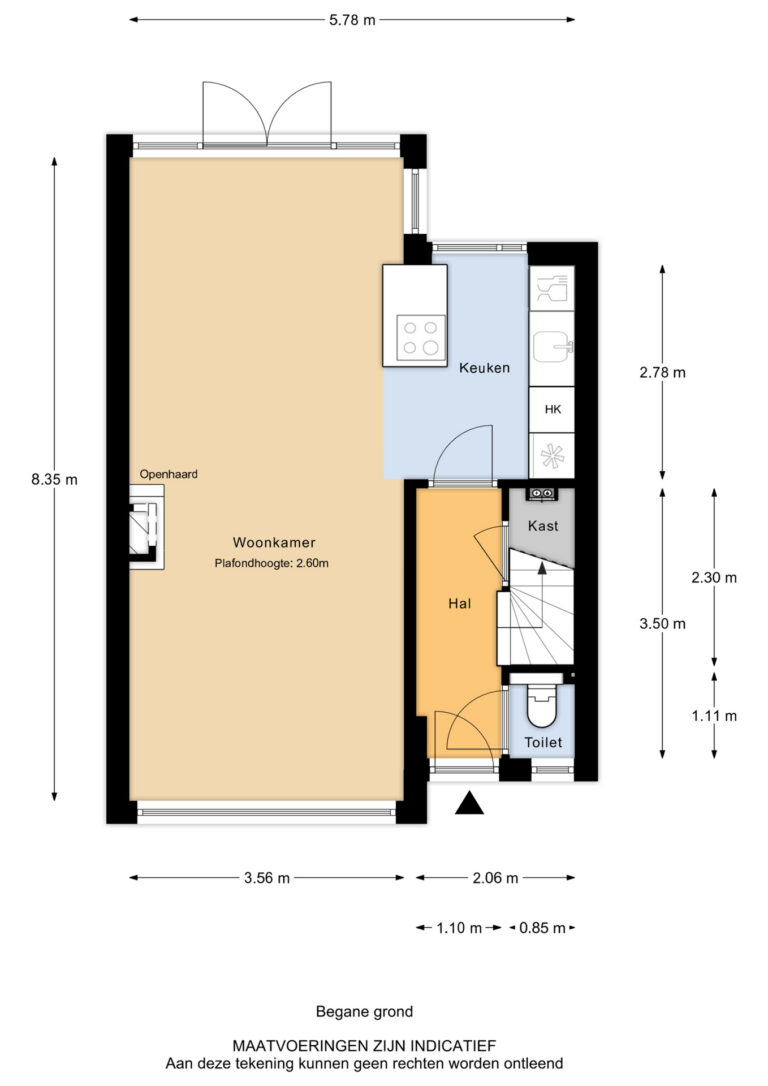 De ruime entree met lange hal geeft toegang tot de open keuken en woonkamer, toiletruimte en een bergkast onder de trap. De begane grond is voorzien van een stijlvolle PVC-vloer.